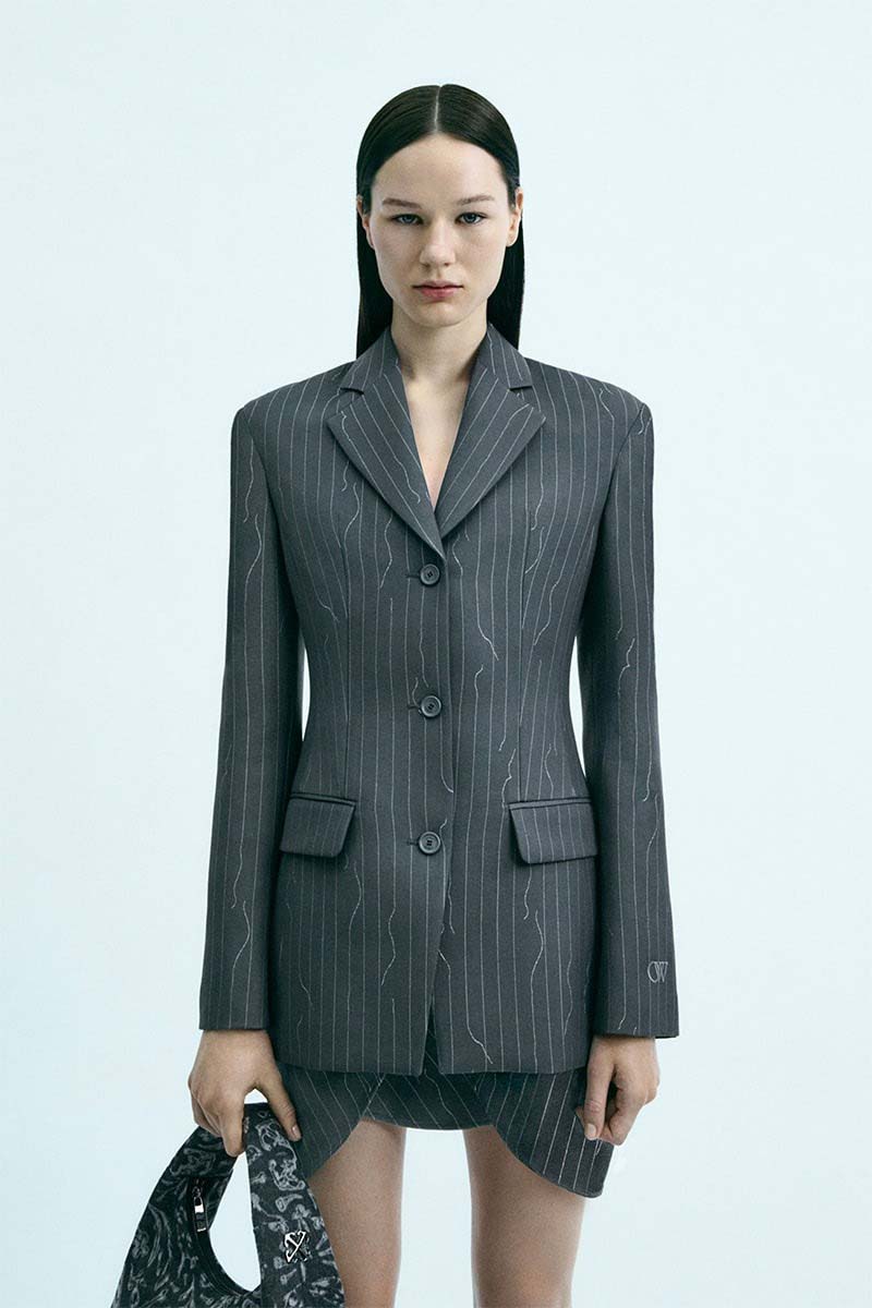 Uno de los pilares sobre los cuales Off-White se fundamentaba como un pilar urbano era su estética cargada de logos y distintivos; como el sello de las cuatro flechas, por ejemplo. Aquí lo vemos reinterpretado en conjuntos de denim estampado de corte baggy, en los patrones de tops de punto y en los accesorios tan minimalistas que nos encantan. La brida también se deja ver en los bolsos de cuero, aunque ahora de manera más disimulada.