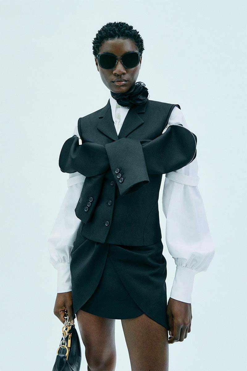 Comenzando con Off-White Resort 2024 tenemos la sastrería; punto central de la colección que presentó reinterpretaciones contemporáneas de un estilo virtualmente sin cambios desde hace 100 años. La clásica silueta sartorial de americana extremadamente boxy con pantalones holgados estuvo más que presente; pero lo interesante estuvo en las iteraciones deconstruidas del dos piezas y en los híbridos de chaqueta deportiva y americana formal. Otro punto fuerte, y muy interesante de Resort 2024, fue la oferta de womenswear. Fue aquí donde la hibridación entre clasicismo y ropa deportiva se hizo más evidente con vestidos y tops pensados para acentuar la silueta femenina. Encaje con tejido técnico; para resumirlo.