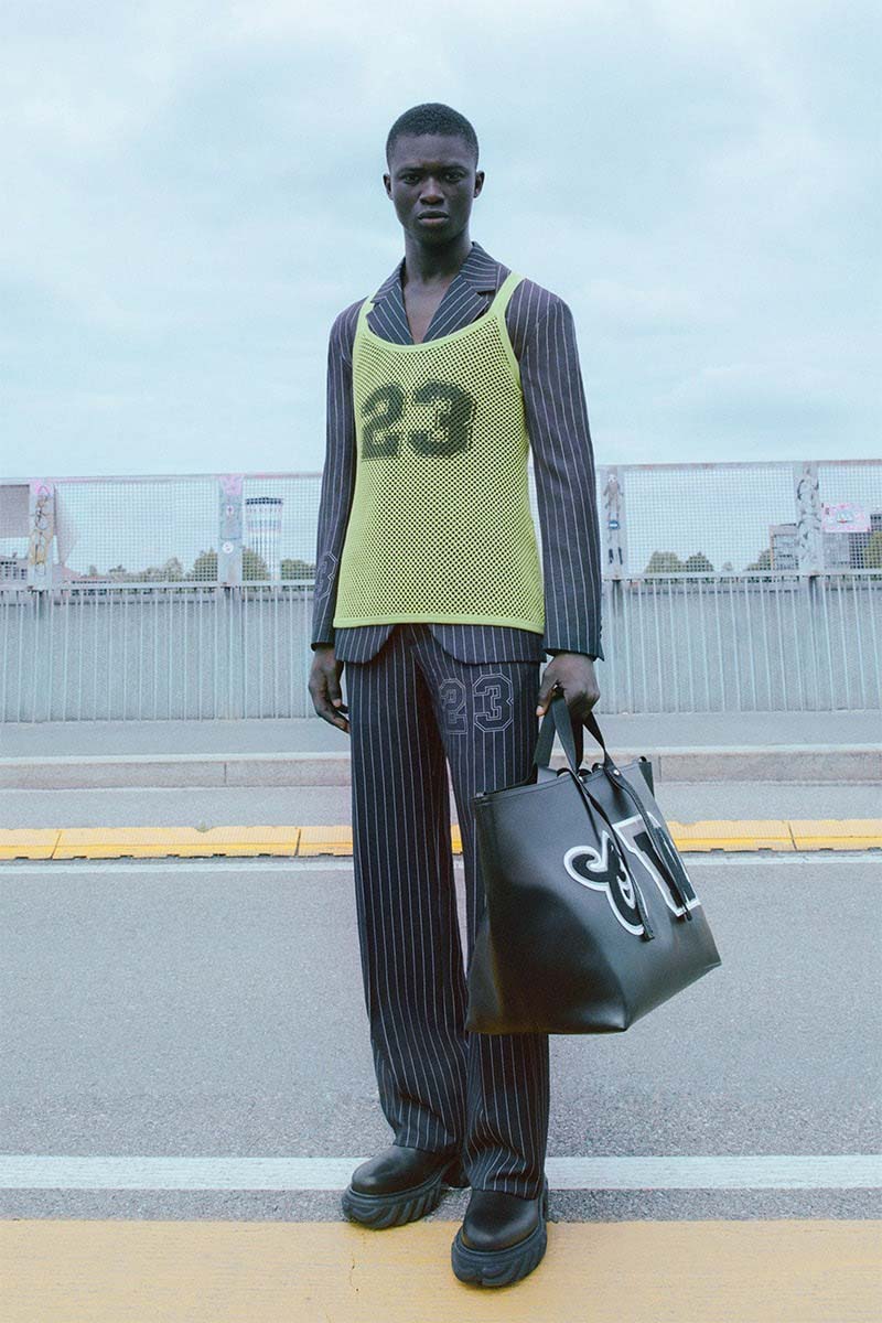 Como punto más deportivo de Off-White Resort 2024, Ib Kamara hace un guiño a su colabo de la firma con los Chicago Bulls incorporando piezas y elementos de su indumentaria a lo largo de toda la colección. Y ya como homenaje clarísimo, referencia a Michael Jordan con los detalles de sus prendas adornándolas con el número 23. Otros elementos familiares como chaquetas utilitarias de inspiración militar, pantalones cargo y conjuntos de chándal también tienen su comeback a lo largo de la colección.