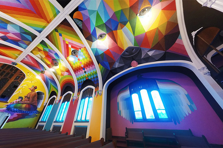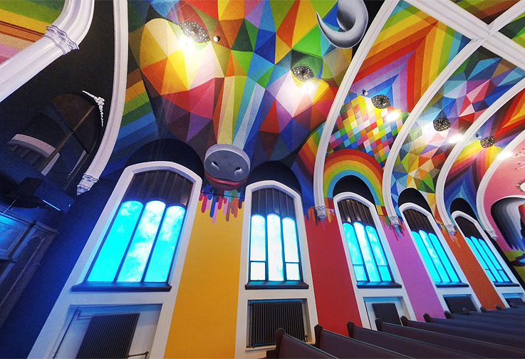Tras “Kaos Temple” (Llanera, Asturias), “11 Mirages to the Freedom” (Youssoufia, Marreucos) y “Univesal Chapel” (Fort Smith, Arkansas), Okuda San Miguel nos hace partícipes de su cuarta intervención en año y medio sobre uno de los soportes arquitectónicos clásicos en la historia del arte: las iglesias.