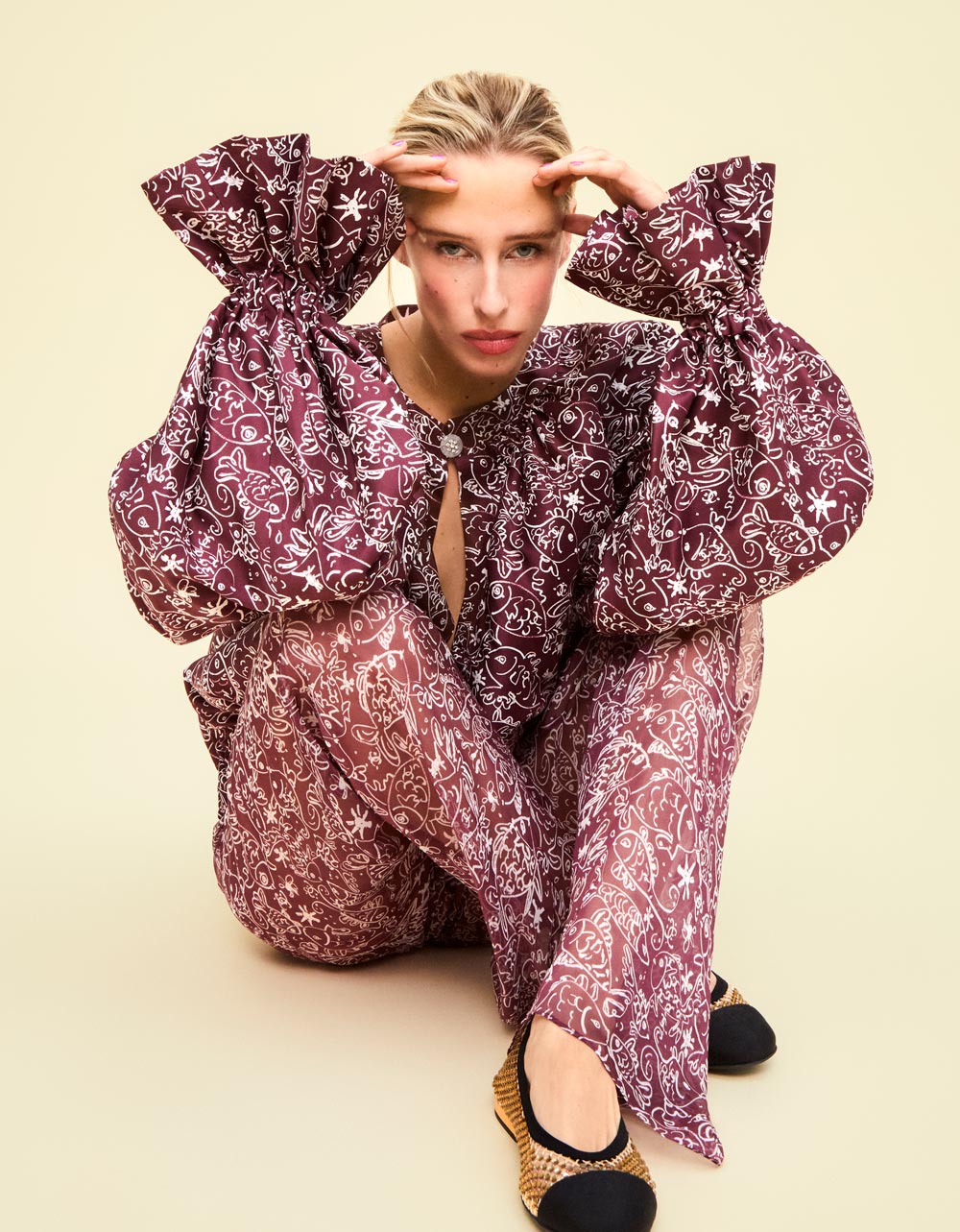 CHANEL Beauty: (ojos) Paleta exclusiva enchanted night + Máscara de pestañas noir allure noir + (labios) Rouge allure l’extrait orange polaire + (tez) Ultra le teint B10 + crema y serum N.1 + (pómulo) Joues contraste intense rouge franc / CHANEL Moda: Blusa y pantalones de seda + Bailarinas de strass