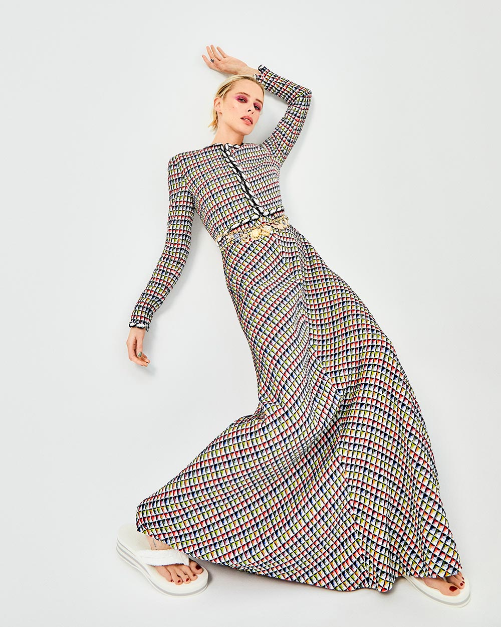 CHANEL Beauty: (ojos) Paleta exclusiva enchanted night + Rouge coco gloss rose pulpe + Máscara de pestañas noir allure noir + (labios) Rouge allure l’extrait beige brut + (tez) Ultra le teint B20 + crema y serum N1 + (pómulo) Joues contraste reflex / CHANEL Moda: Vestido de tweed de algodón + Cinturón joya de metal y strass + Sandalias