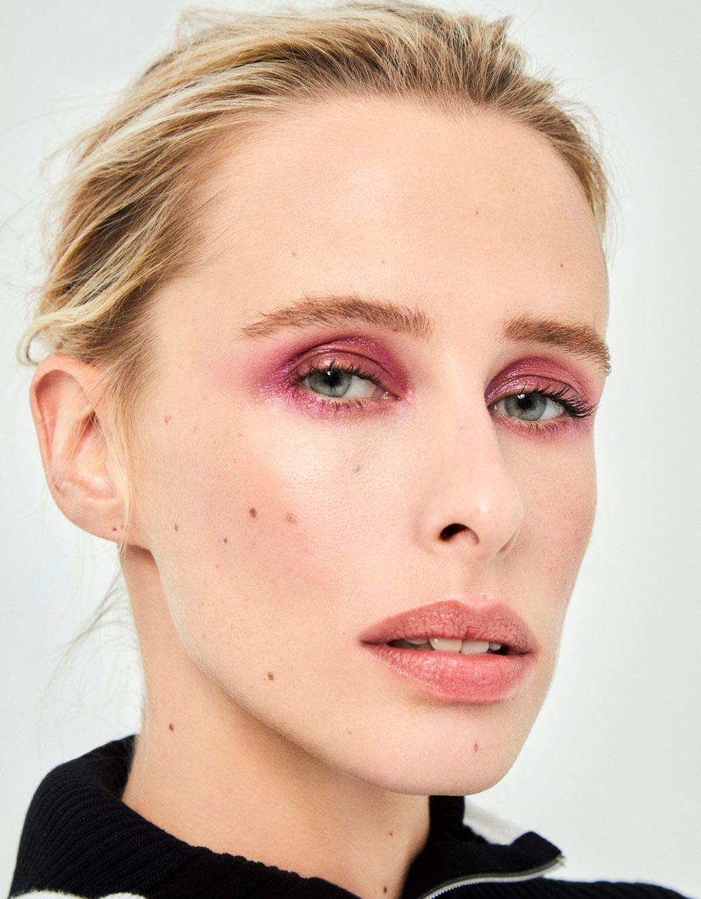 CHANEL Beauty: (ojos) Paleta exclusiva enchanted night + Rouge coco gloss rose pulpe + (labios) Rouge allure l’extrait beige brut + (uñas) Le vernis storyteller / CHANEL Horlogerie: Reloj CHANEL J12 calibre 12.2, 33 mm, realizado en cerámica de alta resistencia blanca y acero, índices con diamantes / CHANEL Moda: Jersey de algodón + Mono tejano
