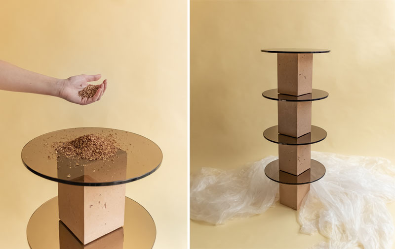 Los deshechos se ligan con cemento, generando así un compuesto inorgánico-orgánico y consiguiendo un material más ligero y con mejores capacidades que el cemento normal. El resultado, unos bloques modulares que se pueden emplear para crear múltiples configuraciones, se combinan en este caso con capas de vidrio bronce para formar un pedestal apilado.