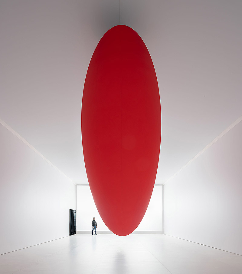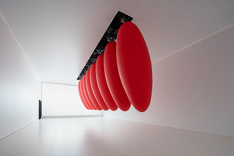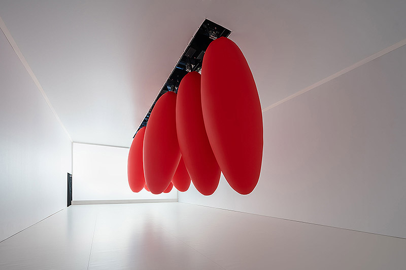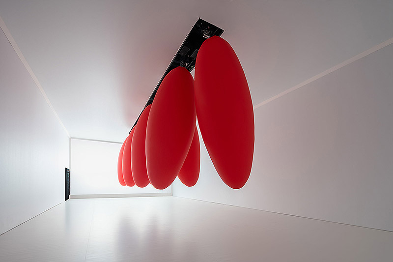 “Ovoids” presenta ocho ovoides rojos suspendidos del techo, que se mueven en secuencias pendulares e hipnóticas. Esta instalación, está comisionada por el Ballon Museum de Roma.