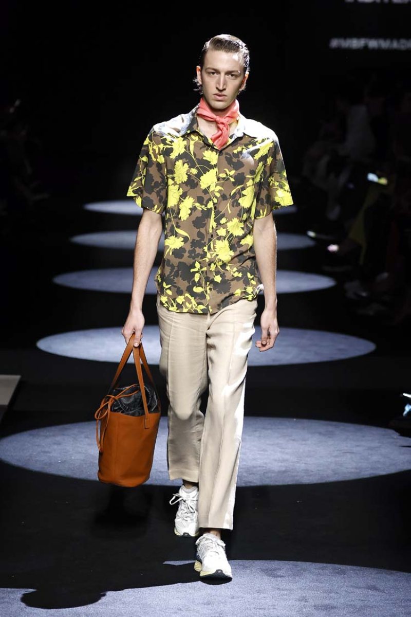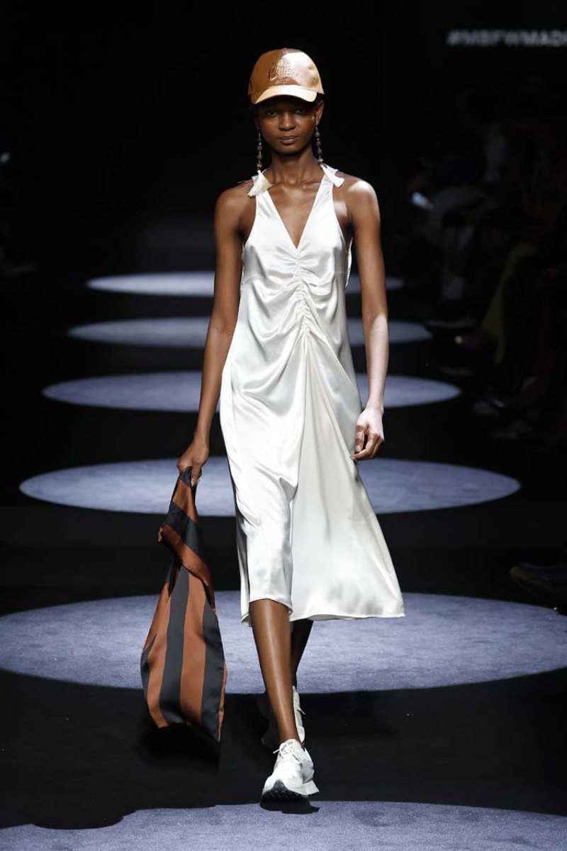 Pablo Erroz en la 79ª edición de Mercedes-Benz Fashion Week Madrid tuvo en cuenta su puesta en escena. Aspecto que tiene muy en cuenta en todos sus desfiles, y en este no podía ser menos. El diseñador puso en juego su forma de decorar y su visión espacial para configurar una pasarela única y auténtica. Gracias a esto el público observó mucho mejor elementos, detalles o tonalidades de la nueva colección. Al igual que las colaboraciones que han estado presentes en las prendas, como Grefusa, New Balance o Chupa Chups. Con esta última marca, el diseñador hizo un homenaje al histórico loco que diseñó Salvador Dalí en 1969. Por cierto, con Grefusa se consolida aún más, porque uno de los vestidos, el concreto el negro, tenía las míticas chapas con la figura de grefusito.