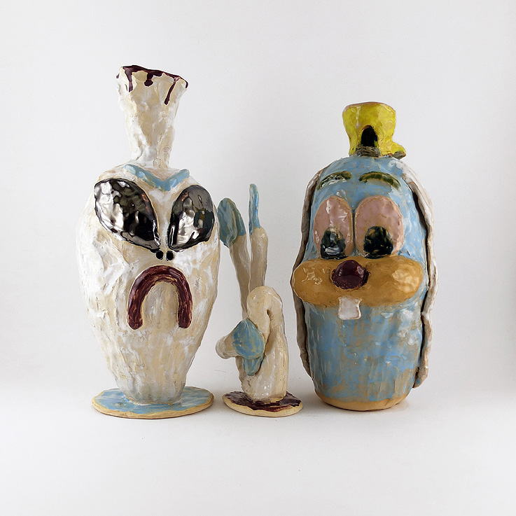 Malarko (1984) son aliens, monstruos y castillos fofos, caras con sonrisa de Ray Bans y Bongs de piña loca. Dentro de una onda joven con temas del mundo del cartoon y la fantasía teen, su trabajo tiene un tono desenfadado de al carajo. Para entender la obra cerámica de este artista afincado en Londres hay que conocer la influencia del Grafitti, campo en el que también trabaja. Algunas de las piezas más interesantes son sus bustos; caricaturas de animales de texturas temblorosas y esmaltadas en coloridos pastel. Di con su obra visitando una exposición en Espacio Ananas, una galería muy yeyé de Madrid. Allí estaba su retrato de Duchamp, un ratón azul con aire de Billy Idol y un pendiente con una mierda de plata colgando. Su trabajo guarda referencias con la cultura pop y trasmite cierta sorna sobre el mundo del ocio y el descanso, piezas como gorritas muy apropiadas.