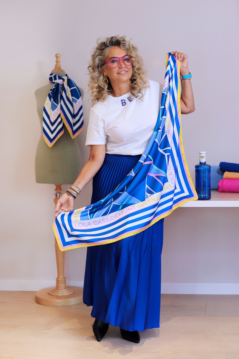 La competición de vela más importante del mundo, que empezó el 22 de agosto y finaliza en octubre, está siendo una fábrica de nuevos diseños para Lola Casademunt. Y esto te lo destacamos porque hay una nueva colaboración entre la diseñadora y la marca de agua mineral natural, Solán de Cabras. ¿Y qué han elaborado juntas? Nada menos que un fabuloso pañuelo estilo navy que ya llevan muchos de los que están por allí, viendo las regatas que están atrayendo a mucho público, porque se puso pantallas para verlo al aire libre.