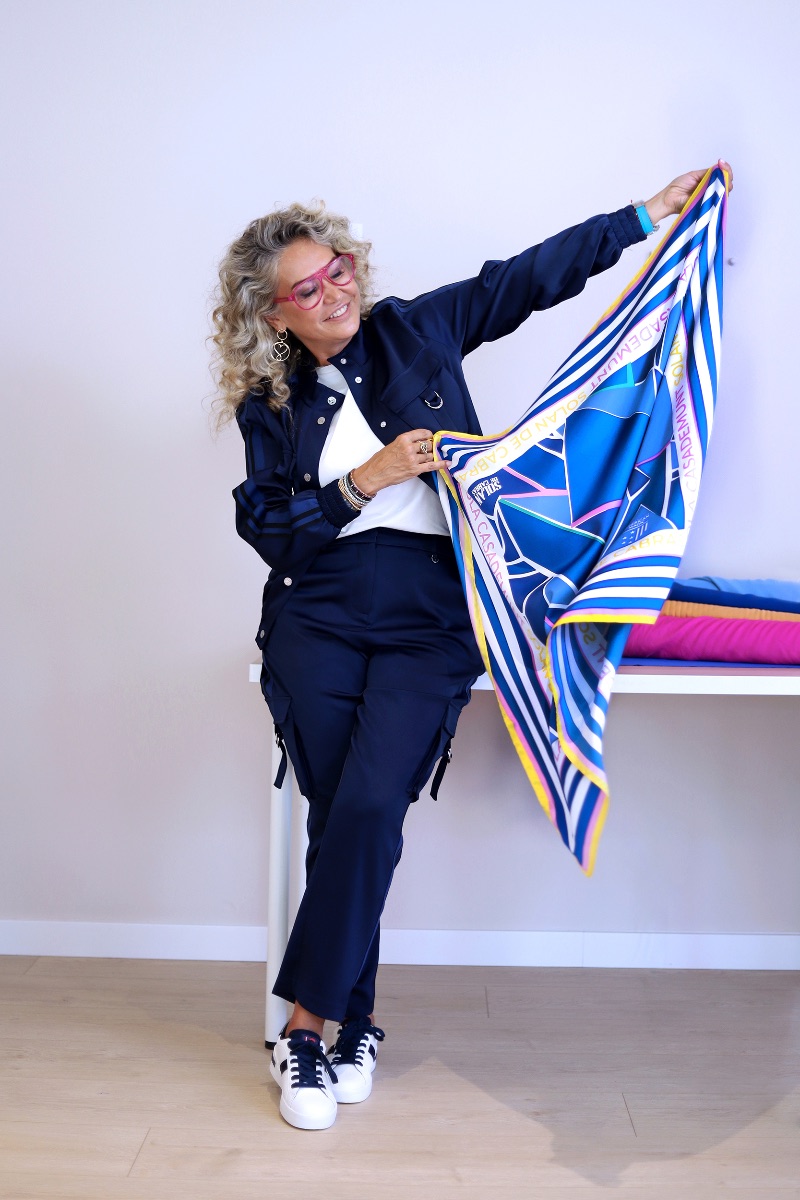El pañuelo de estilo navy es la mejor interpretación de cómo son los uniformes formales del American Magic. Dichos uniformes que también han sido diseñados por Lola Casademunt. Además, este pañuelo estilo navy es una manera de acercar el mundo de la vela al público y que ese estilo tan propio de este deporte se traslade al street style. Por supuesto, este accesorio que lo vas a combinar con un conjunto relajado y demure, lo podemos definir como un diseño único, sofisticado y vibrante.