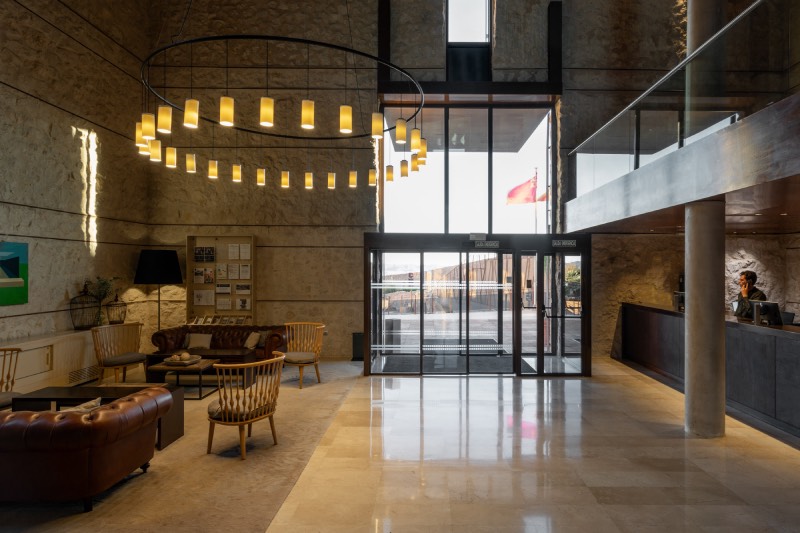 Butacas Nub diseñadas por Patricia Urquiola para Andreu World y Lámpara Cirio de Antoni Arola para Santa & Cole en el hall del Parador de Lorca