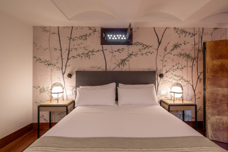 Una habitación del Parador de Granada con una lámpara Cesta diseñada por Miguel Mila para Santa & Cole en cada mesilla de noche