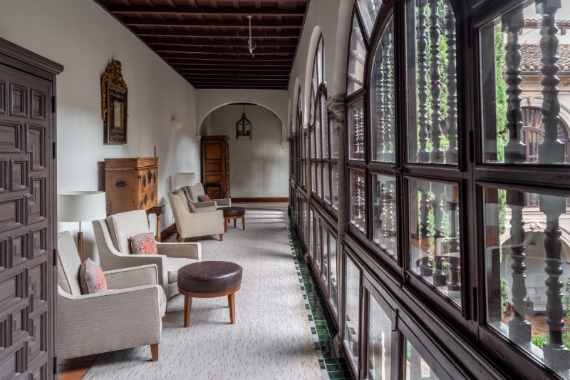 Las lámparas Fad de Miguel Milá para Santa & Cole iluminan esta galería del Parador de Granada