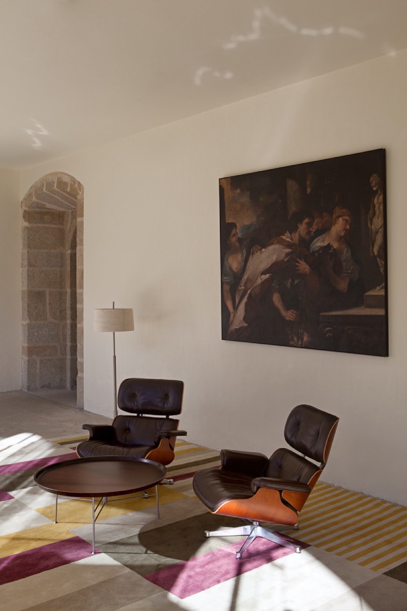 Otro de los asientos clave en la historia del diseño es la Lounge Chair, del matrimonio norteamericano formado por Charles y Ray Eames. La silla diseñada en 1956 se ha convertido en un clásico del diseño moderno. Los creadores quisieron modernizar el antiguo sillón de club inglés y para conseguirlo combinaron materiales confortables de alta calidad. Como resultado obtuvieron una silla cómoda, ligera y elegante. Su estética con cuero en el interior y madera en el exterior se combina con la funcionalidad de sus materiales. Están situadas en un rincón muy especial del Parador de Santo Estevo, junto a una pintura del siglo XVII de Luca Giordano.