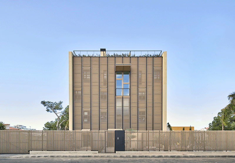 Las fachadas principales se sitúan en las mejores orientaciones, vistas y jardines, además, presentan persianas de madera horizontales y plegables que actúan como filtros solares. Este elemento dinámico se inspira en pérgolas y celosías mediterráneas tradicionales. Unos paneles que son parte fundamental del proyecto por su función para la climatización pasiva.