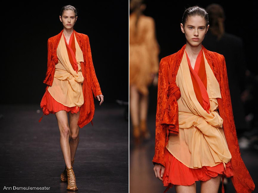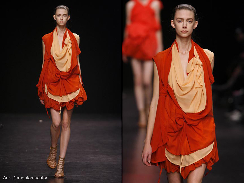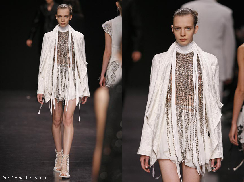 En el caso de Ann Demeulemeester había algo que no sabría decir que lo hacia realmente atractivo y distinto a lo que caracteriza a la diseñadora. Hacia uso de los ya habituales blanco y negro pero esta vez se lanzaba a los corales, naranjas y al color nude dentro siluetas estructuradas y con volúmenes que daban un aire sexy bastante peculiar en las modelos. Los vestidos estaban adornados con cristales bordados y cadenas, dando un toque gótico pero muy femenino a la vez, y quizás sea ese equilibrio entre esos extremos, entre los colores sencillos y los adornos elaborados lo que hace que la colección sea potente y con sello de identidad propio.