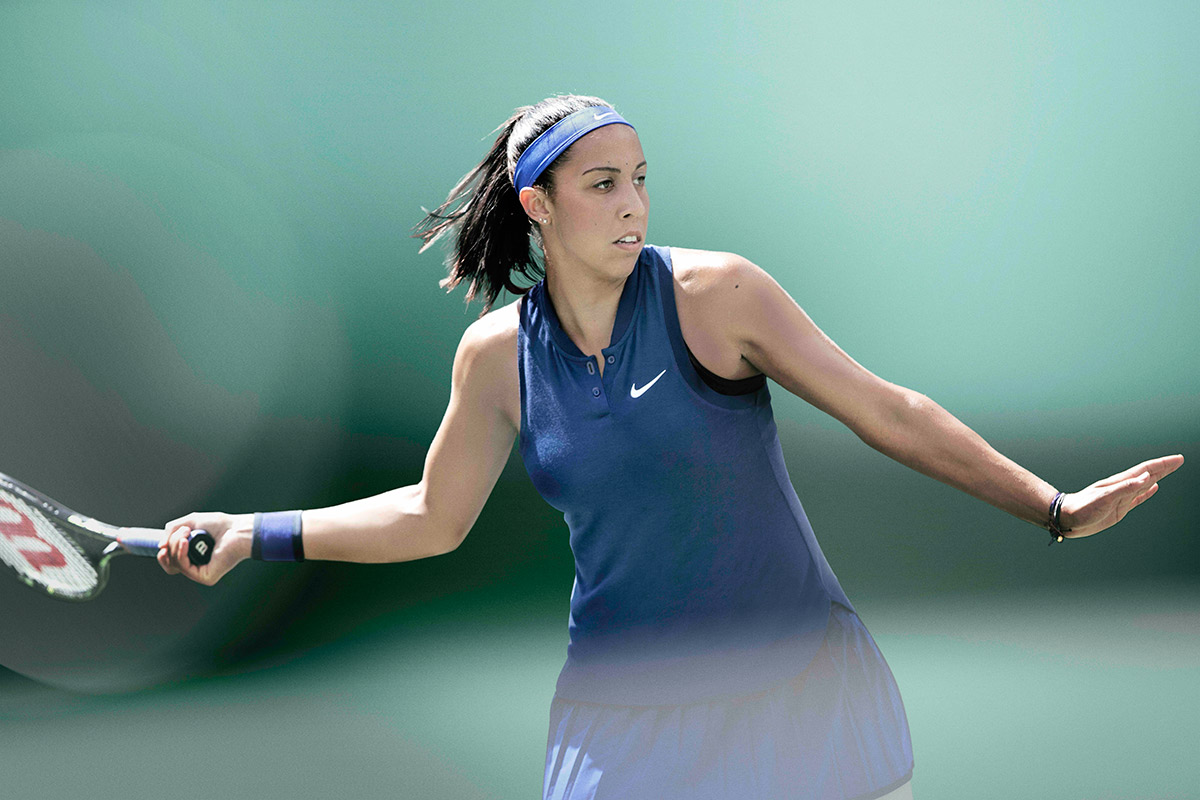 Arriba: Madison Keys con polo NikeCourt Premier Advantage Sleeveless y falda NikeCourt Victory. El polo de Keys cuenta con un cuello tipo Blade y tejido Dri-FIT que ayuda a expulsar el sudor de la piel. La falda plisada está diseñada para proporcionar movilidad óptima y resaltar el cuerpo en movimiento. La cintura, que ha tomado prestada de los modelos de ropa de entrenamiento de mujer de Nike va unida a un pantalón interior que minimiza distracciones.