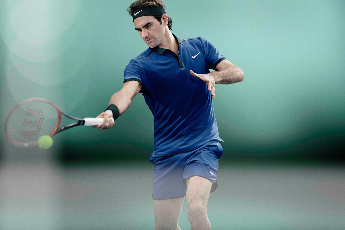 Arriba: Roger Federer con el Polo NikeCourt Advantage RF cuenta con el cuello tradicional en tenis y un diseño entallado y moderno. Los refuerzos de la axila permiten una amplitud de movimiento óptimo, mientras que la ventilación a través de perforaciones a láser y el tejido Dri-FIT ayudan a Federer a mantenerse fresco y cómodo.