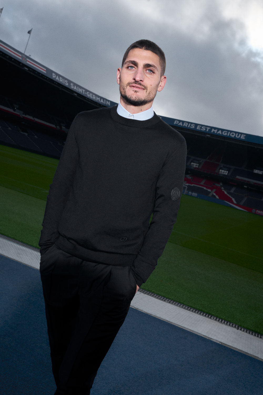 Kim Jones ha visualizado 2 elegantes looks para los jugadores del PSG. El común de los dos es el negro. Uno es más desenfadado y se compone de un polo, un jersey de punto y una chaqueta Harrington. Todas las prendas han sido personalizadas con el parche bordado “Paris Saint-Germain” y las iniciales “CD Icon”, en combinación con unos zapatos derbies Dior Explorer en cuero negro punteados por el mítico oblicuo Dior en tonos acordes. Todo el look se complementa con el bolso Dior Lingot decorado con el motivo diamantes CD.