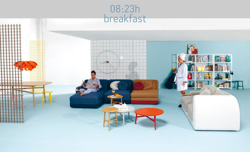 Detrás de Party hay una cuidada realización artesanal y un toque estético fresco y colorista. Combinaciones duotono, cojines plataforma, mesitas auxiliares o reposabrazos, son elementos que le aportan un punto diferenciador. Una pieza 24 horas funcional.