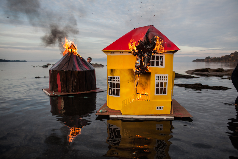 Lago Bulo es una acción filmada en video que Pilar Quinteros realizó en Frutillar, en la orilla del lago Llanquihue (sur de Chile) en 2016 donde se quemaron dos modelos de cartón a escala de edificios clásicos locales: una casa colonial alemana y una ruca indígena mapuche. Estos representan, en parte, los orígenes de la ciudad, los conflictos territoriales y la lucha de una cultura para imponerse y prevalecer sobre otra, mientras comparten el mismo espacio físico. “Bulo” es una palabra que se refiere a noticias falsas que se difunden para beneficiar a alguien, lo que explica cuántas versiones de una historia pueden existir dentro de un territorio, dependiendo de quién la cuente. El video cuenta, a través de la voz en off de un miembro de la comunidad mapuche “Lafken Mapu Inchew”, la relación espacial, el respeto mutuo y las consecuencias de la falta de conocimiento y desinterés por las tradiciones antiguas.