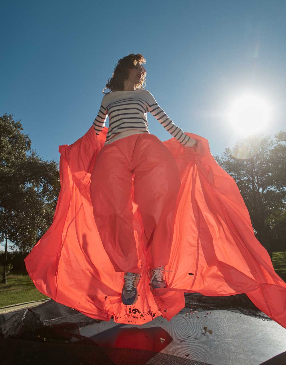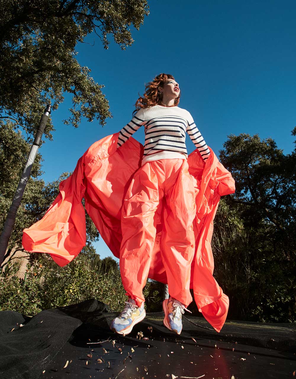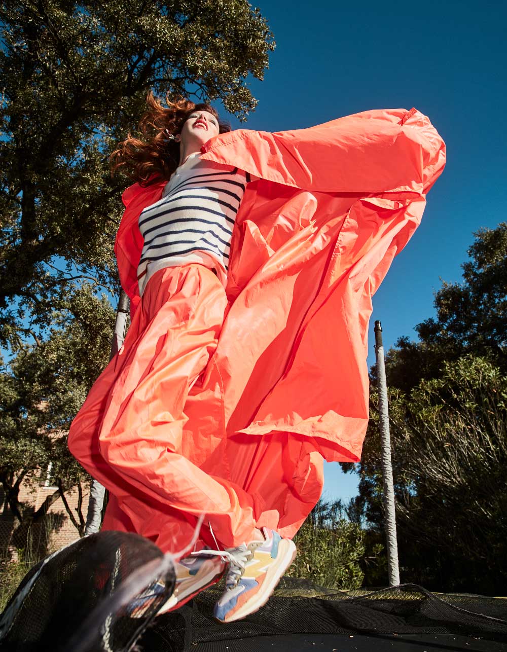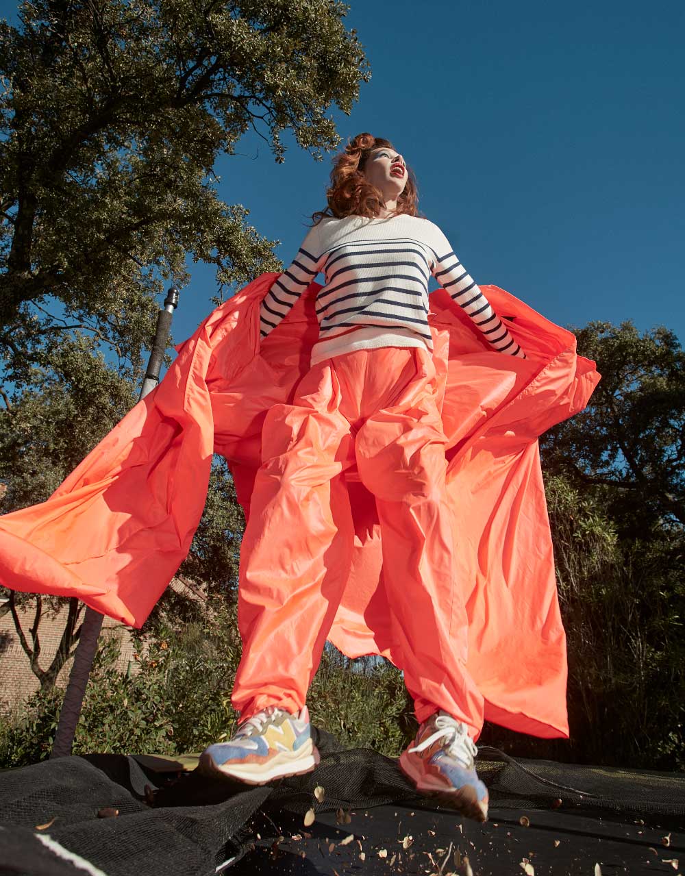 Galería de 4 fotos con Paz de la Huerta con abrigo y pantalón naranja de ROBERTO DIZ, jersey de rayas de INÉS DE LA FRESSANGE para UNIQLO y zapatillas NEW BALANCE