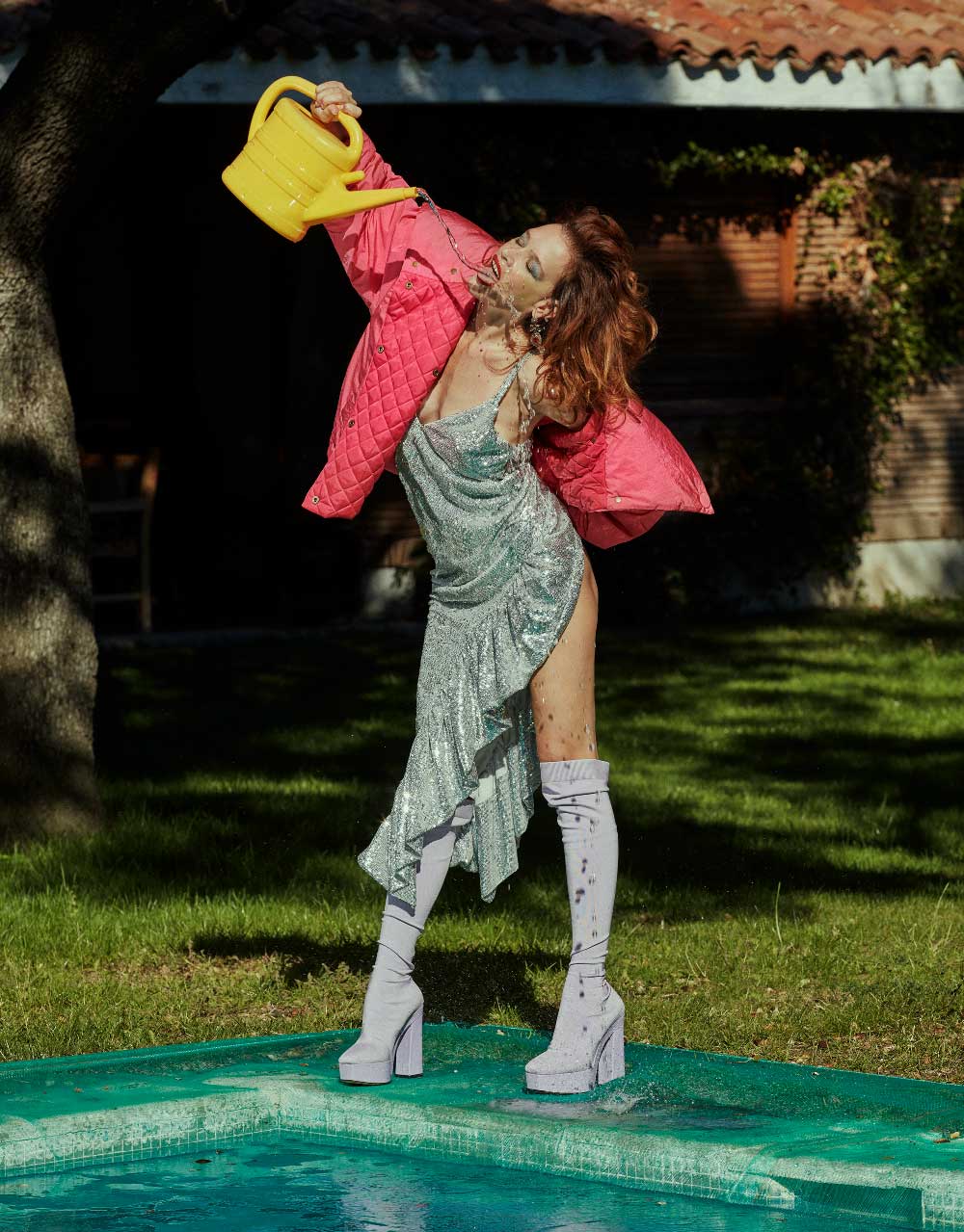 Paz de la Huerta con chaqueta rosa de OFFWEAR y vestido de lentejuelas de H&M Studio