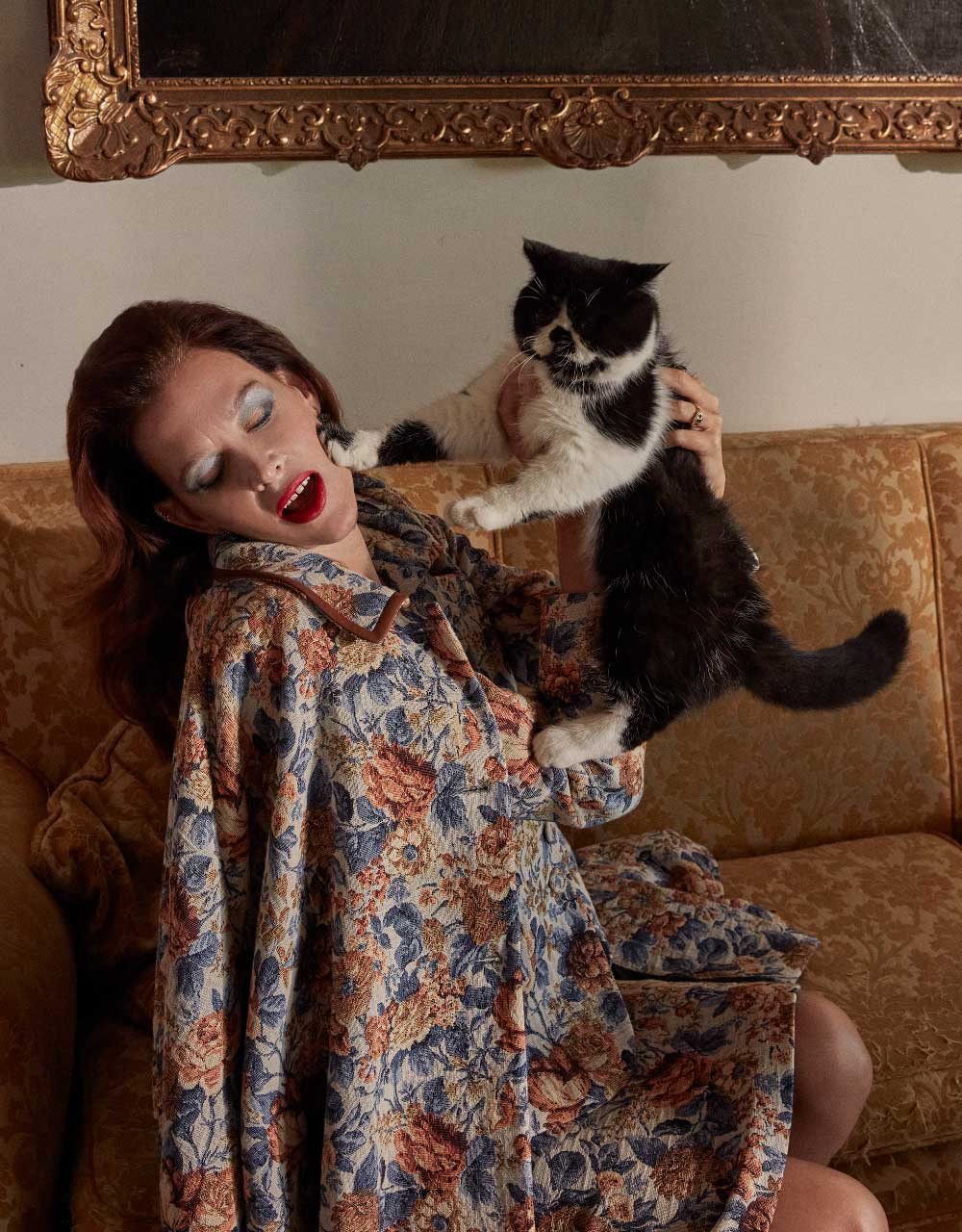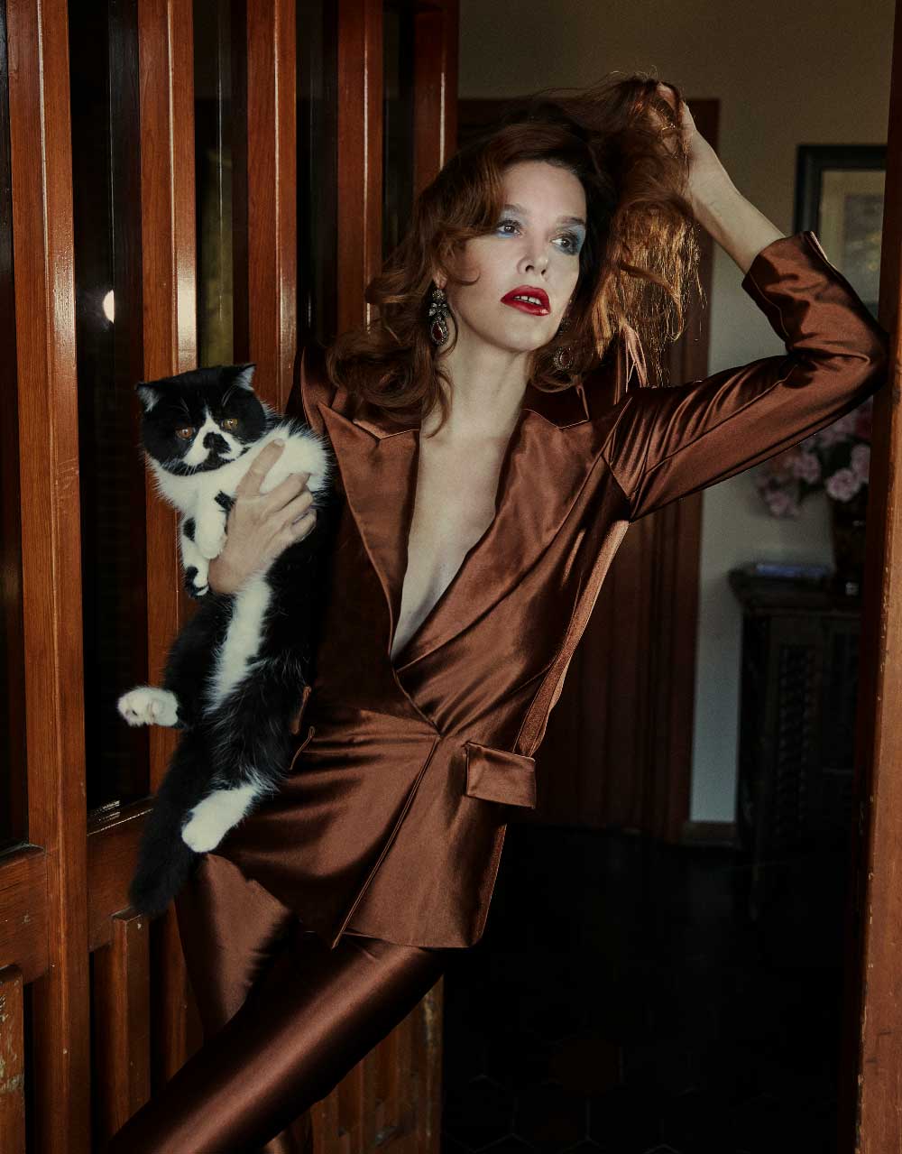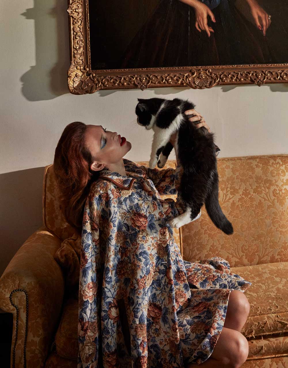 Rafa es increíble. Tiene una energía muy positiva, y un gran sentido de humor. Creo que hemos hecho fotos hermosas. Hay una en particular que quiero colgar en mi cuarto, la del gato. Me encanta modelar, y cuanto más me curo, más hermosa me vuelvo. Estoy feliz de que Rafa me haya capturado en este momento. Quería que me fotografiase desde hace tiempo, pero todavía era víctima y prisionera, así que no podía funcionar. Ahora soy libre, y me siento muy feliz de que haya sido él uno de los primeros en retratarme en mi camino hacia la redención. Su trabajo es hermoso.
