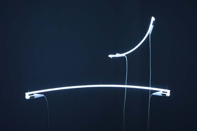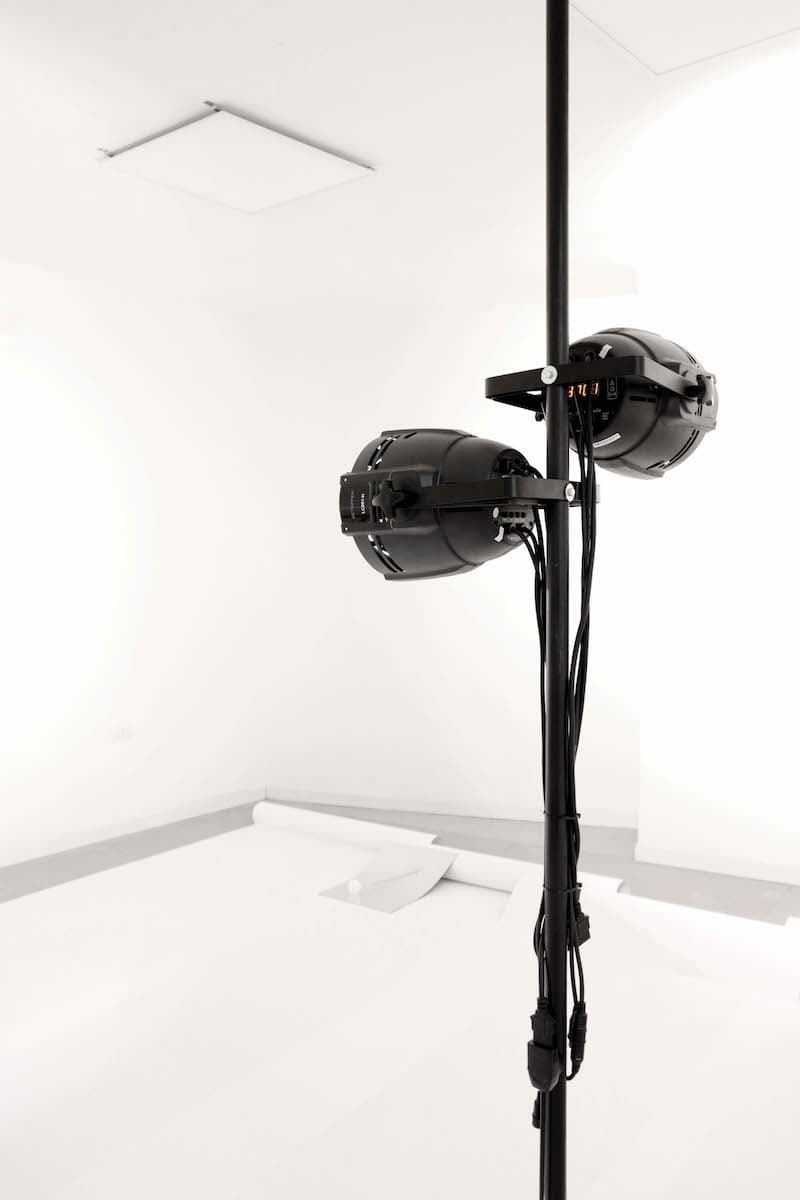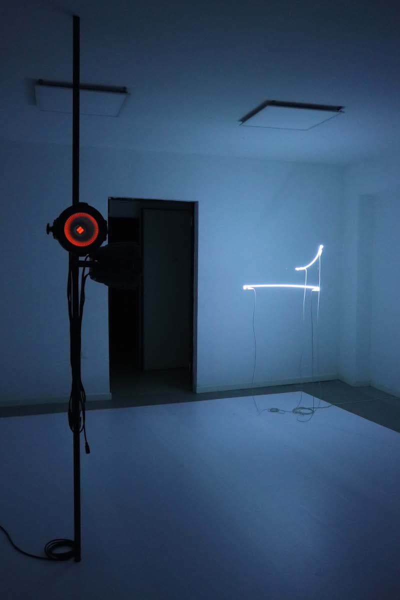 La teoría de los agujeros blancos como campos energéticos, aún no verificada por las ciencias astronómicas, es la que usa el artista para generar una partitura espacial en el espacio expositivo que se revela como un pequeño universo entre las partes que lo componen. Una fuerte luz que incide en las retinas de las personas que visitan el espacio, atrayendo y alejando al mismo tiempo. Luces de neón que subrayan que toda masa, por pequeña e insignificante que sea, produce una curva en el espacio-tiempo. Una voz evoca delicadamente un poema de desintegración, fluctuación y atracción, al tiempo que marca el momento de atravesar este espacio y tiempo.