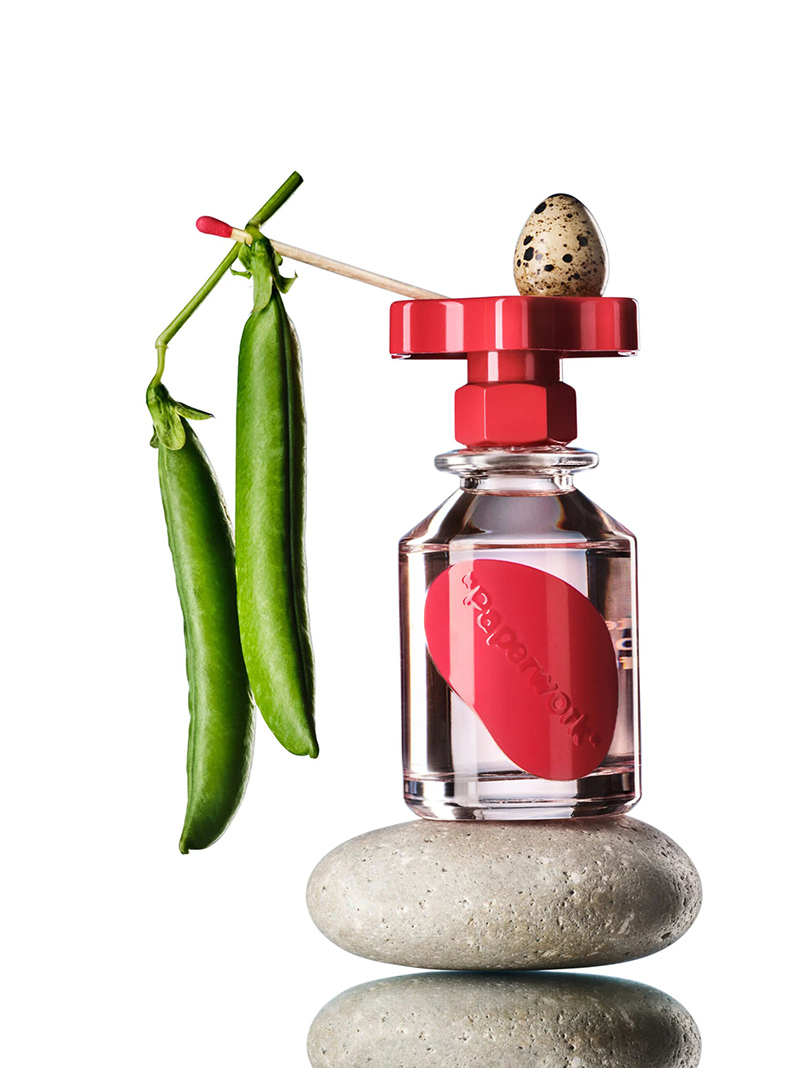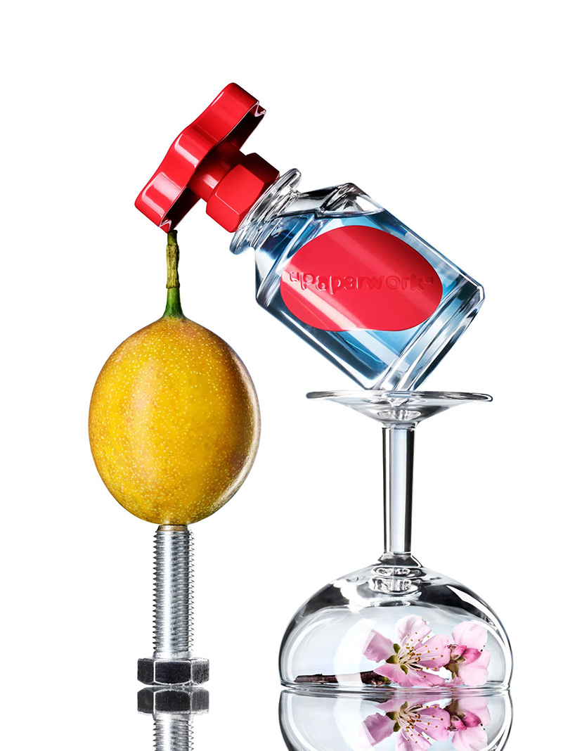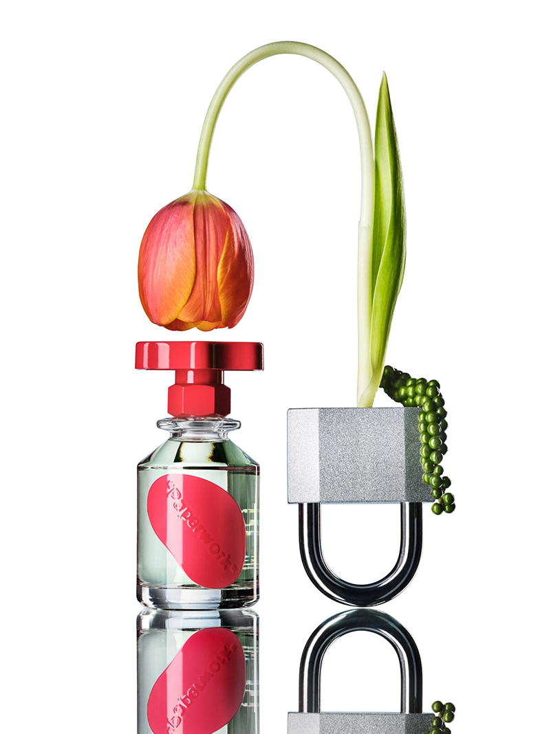 La línea de fragancias “SOLUTION” está compuesta por cuatro eaus de parfum con personalidades completamente distintas; pero son cuatro partes de un todo. La botella, fiel al lenguaje y códigos de diseño de la marca presenta ese aire industrial elevado que tanto conocemos: una llave roja de tubería corona un frasco de perfume muy tradicional, que ha sido salpicado por una gota de pintura que lee “PaperWork”.