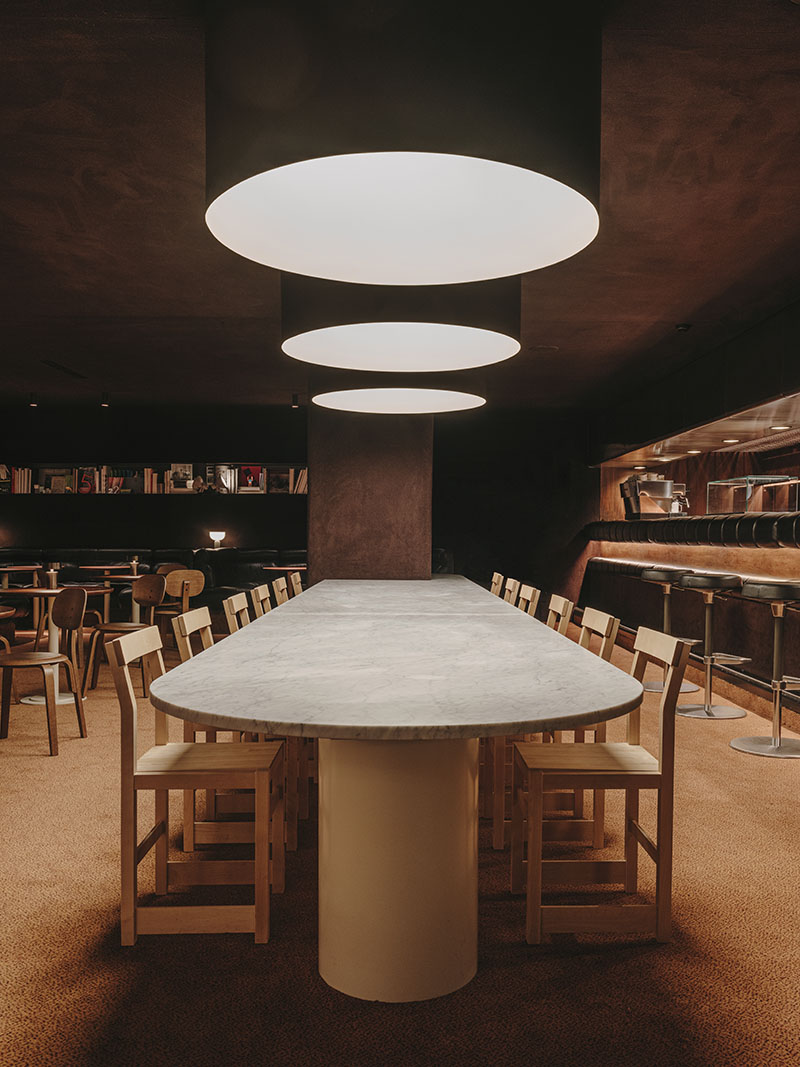Tomemos como ejemplo el Café de la March para entender una manera similar de resolver los problemas y el diseño en los espacios. Se trata de un espacio que está situado en el sótano de la fundación, dos plantas por debajo de la principal. Encontraron un interiorismo que quería escapar de esa condición de cueva, tenían fotos en las paredes como si fueran ventanas al mundo. Ellos, en cambio, asumen la idea subterránea y generan un ambiente más oscuro, más en penumbra. En la parte central de la sala construyen 3 lucernarios (falsos) que iluminan una gran mesa. Cuando presentaron la idea de reforma a la propiedad descubrieron que en el proyecto original de la fundación se preveía un lucernario que traía luz desde la cubierta pero que al final no se llevó a cabo. El resultado es un café muy confortable lumínicamente y con una acústica excepcional ya que la moqueta del suelo también recorre las paredes y el techo. El mobiliario usado rescata los sofás de los años 70s originales junto a otras piezas muy minimalistas de mobiliario actual.