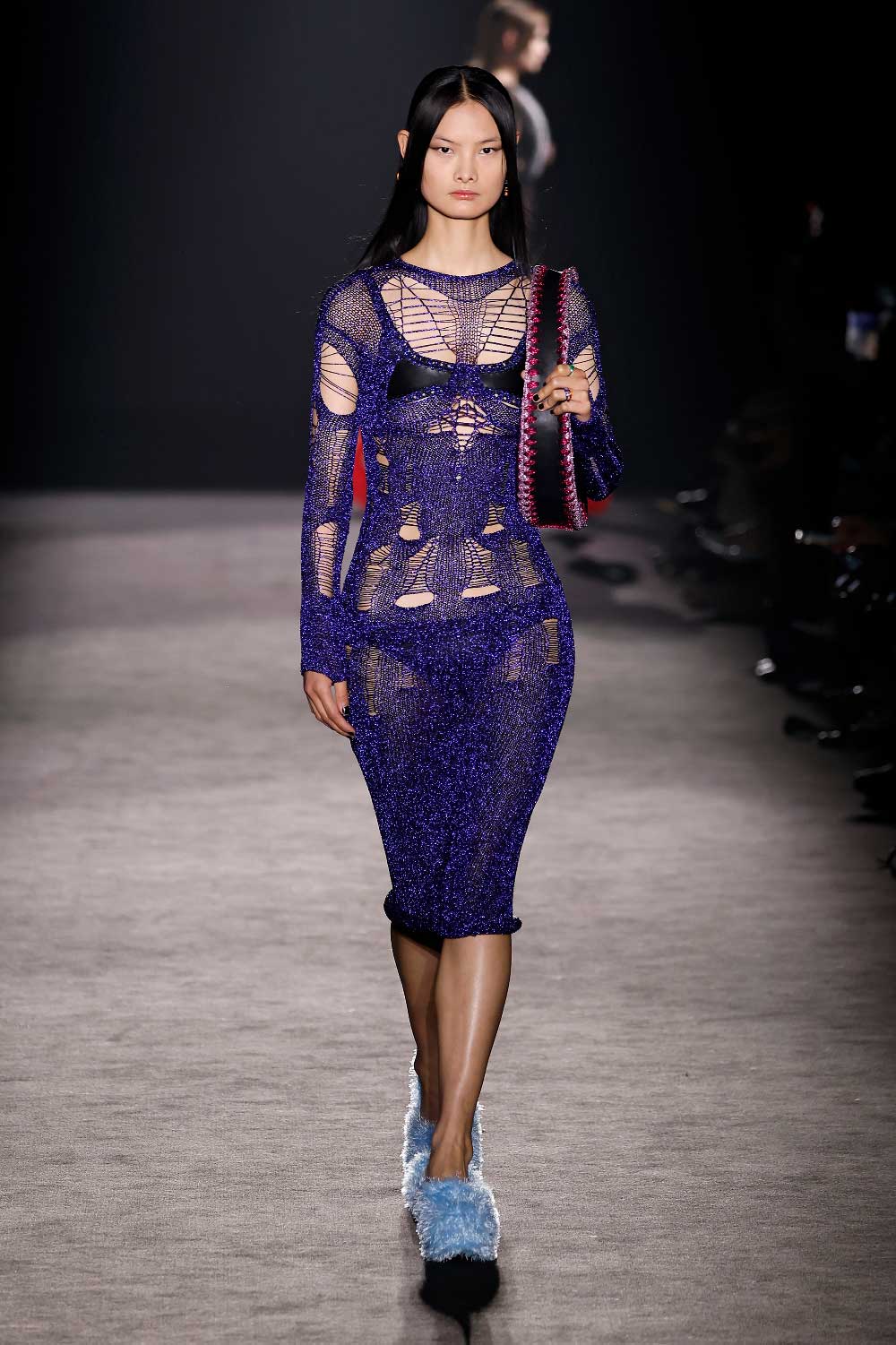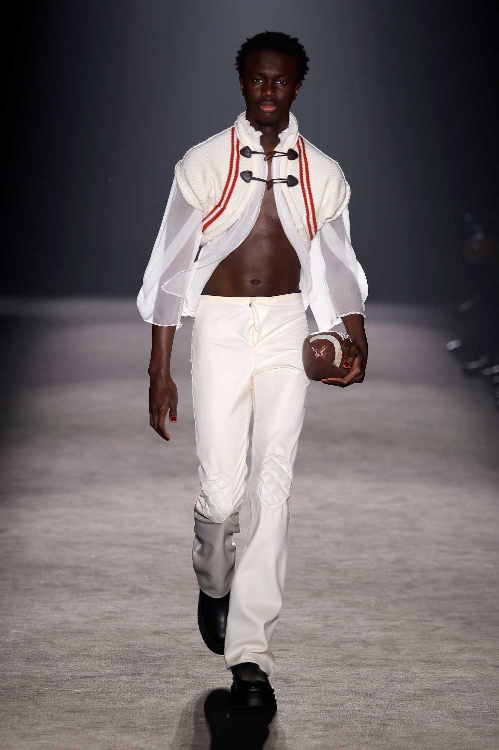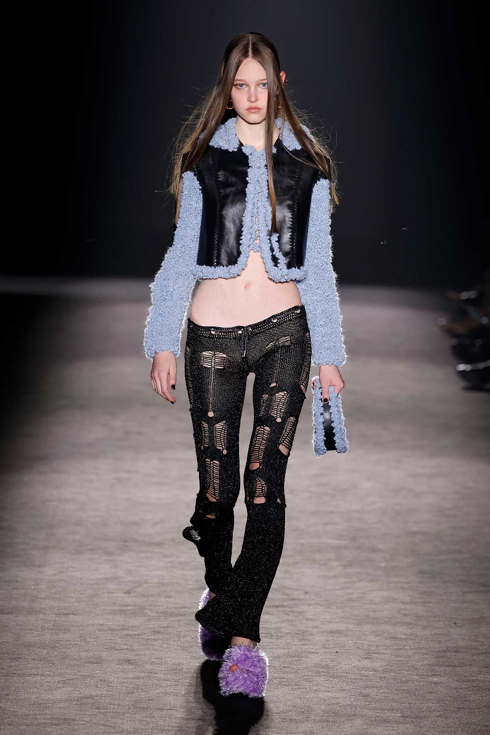 Todo ello se traduce en una colección llena de texturas diversas, donde prendas convencionales adquieren nuevos significados. Plumajes debajo de chaquetas y bordados de piercings evocan una transformación radical.
