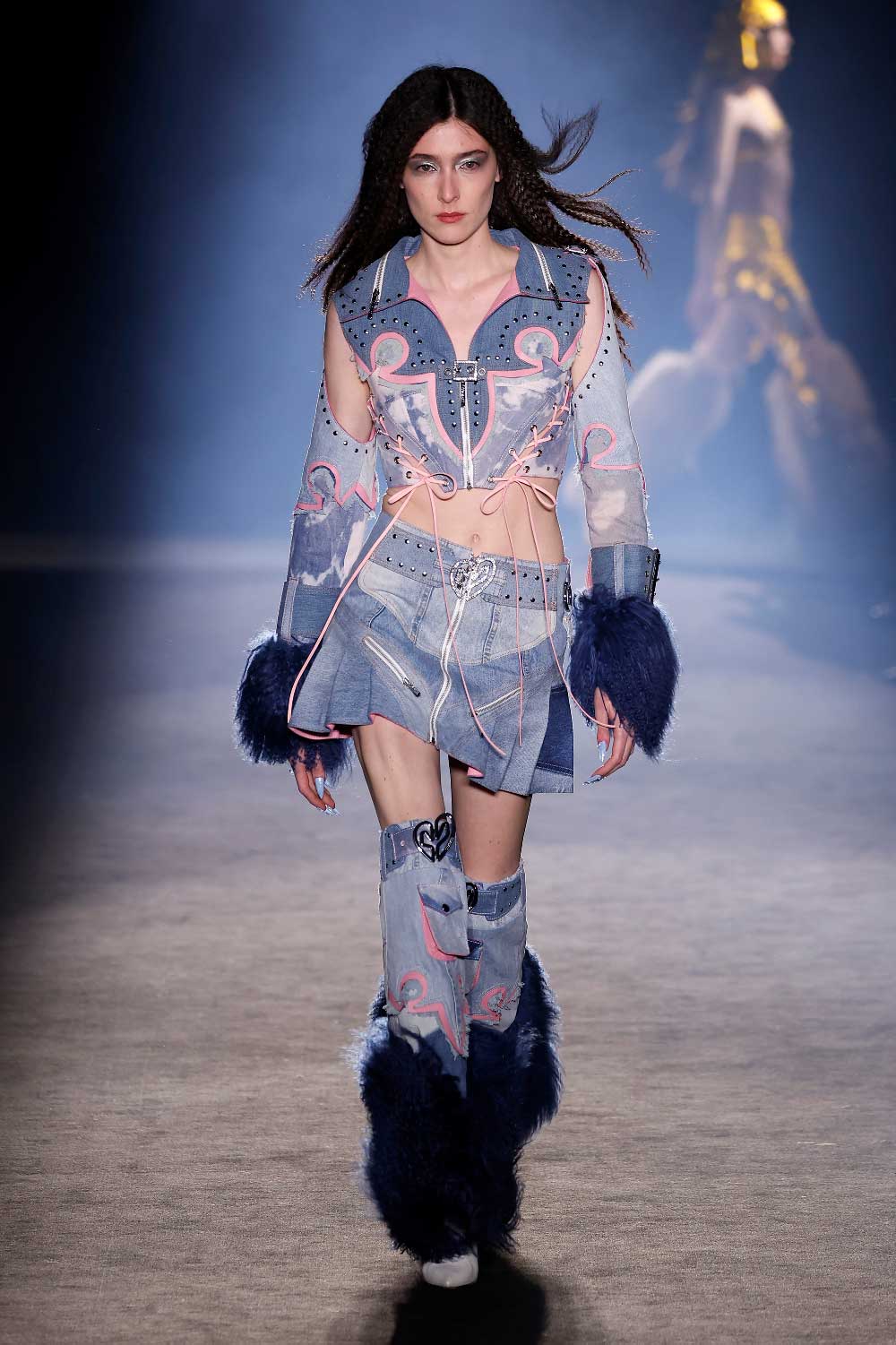 La estética de Dominnico marca el rumbo de las tendencias de invierno más jóvenes. Y lo hace con una propuesta ecléctica y cargada de elementos marinos. Su director creativo, Domingo Rodríguez Lázaro, fusiona siluetas emblemáticas con detalles como blondas, tejido denim, piel reciclada y adornos metálicos, todo dentro de la estética balletcore. Los tonos pasteles clásicos se realzan con toques de verde lima, denim claro y marrones, junto con incrustaciones de pedrería para un toque de brillo.