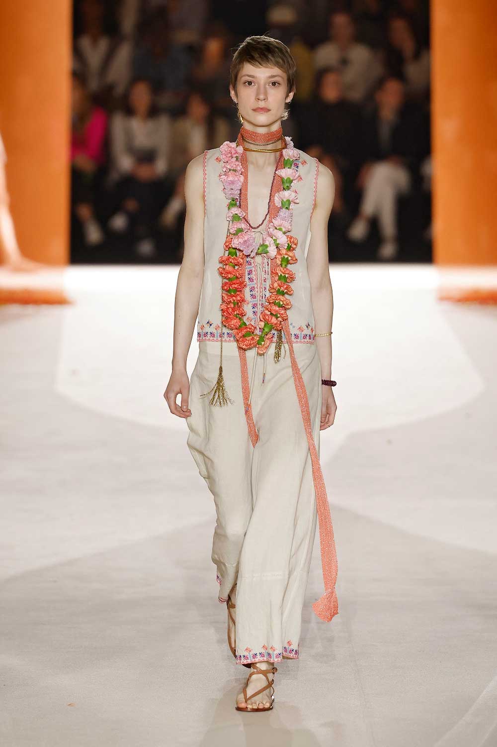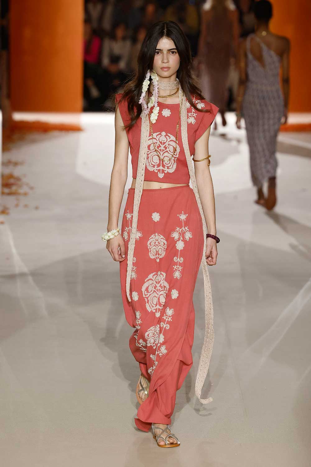La colección Holi de Primavera/Verano 2024 de Hoss Intropía transporta a los espectadores a la efervescencia del festival hindú de los colores con un despliegue de creatividad y artesanía. Cada prenda es una oda a la celebración, con detalles cuidadosamente elaborados y una paleta de colores que evoca la alegría y vitalidad del evento.