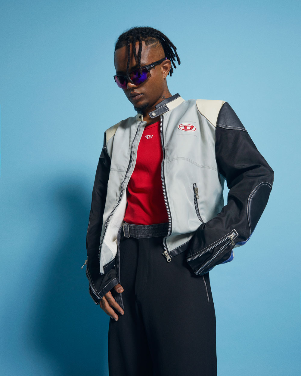 Polimá Westcoast con camiseta, cazadora, pantalón con cinturón denim y collar de DIESEL, más Gafas FILA