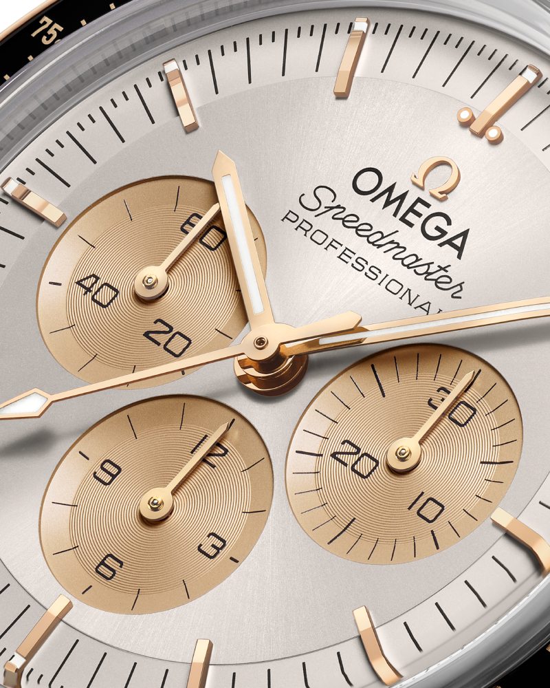 El exterior del nuevo Omega Speedmaster bicolor presenta una caja de acero noble de 42mm acentuada con un bisel cerámico con escala taquimétrica en dorado. Reforzando el look de two-tone, la corona y pulsadores del cronógrafo se presentan en oro amarillo Moonshine de 18k. A juego, tenemos el clásico brazalete del Speedy reimaginado con sus eslabones centrales en el oro propio de Omega, trayendo de vuelta el estilo ochentero que tanto gustó.