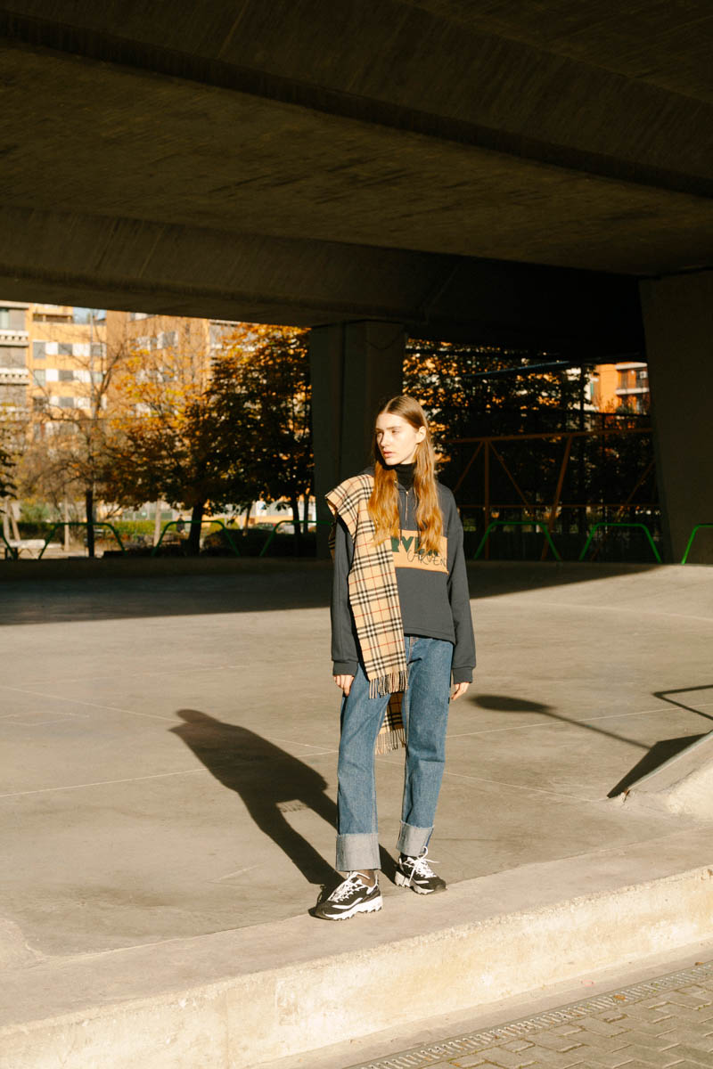 Moda Look 1: Jersey COS + Sudadera Carven + Jeans Duarte + Bufanda Burberry + Sneakers Skechers D’Lites Biggest Fan / Moda Look 2: Jersey Zara + Vestido Noisette + Abrigo Prada + Gorro COS / Moda Look 3: Chaqueta Sandro + Pantalón Amitié en El Corte Inglés / Moda Look 4: Body & Pantalón Bershka + Camiseta Trasher + Sneakers Skechers D’Lites Biggest Fan / Moda Look 5: Sudadera y falda de Amitié en El Corte Inglés + Bolso Marc Jacobs + Sneakers Prada.