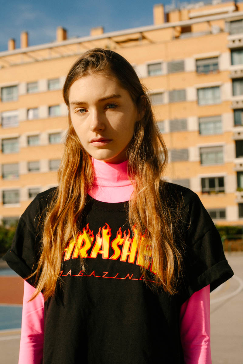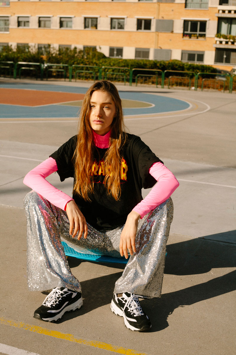 ¿Cuál es el concepto de este editorial? Es una niña bien de pasado Punk, patinando con sus zapatillas Skechers y Prada. Sin mirar atrás, solo ella, valiente, independiente, no necesita nada. Pequeña diabla crea poesía solo con pasear por tu barrio.