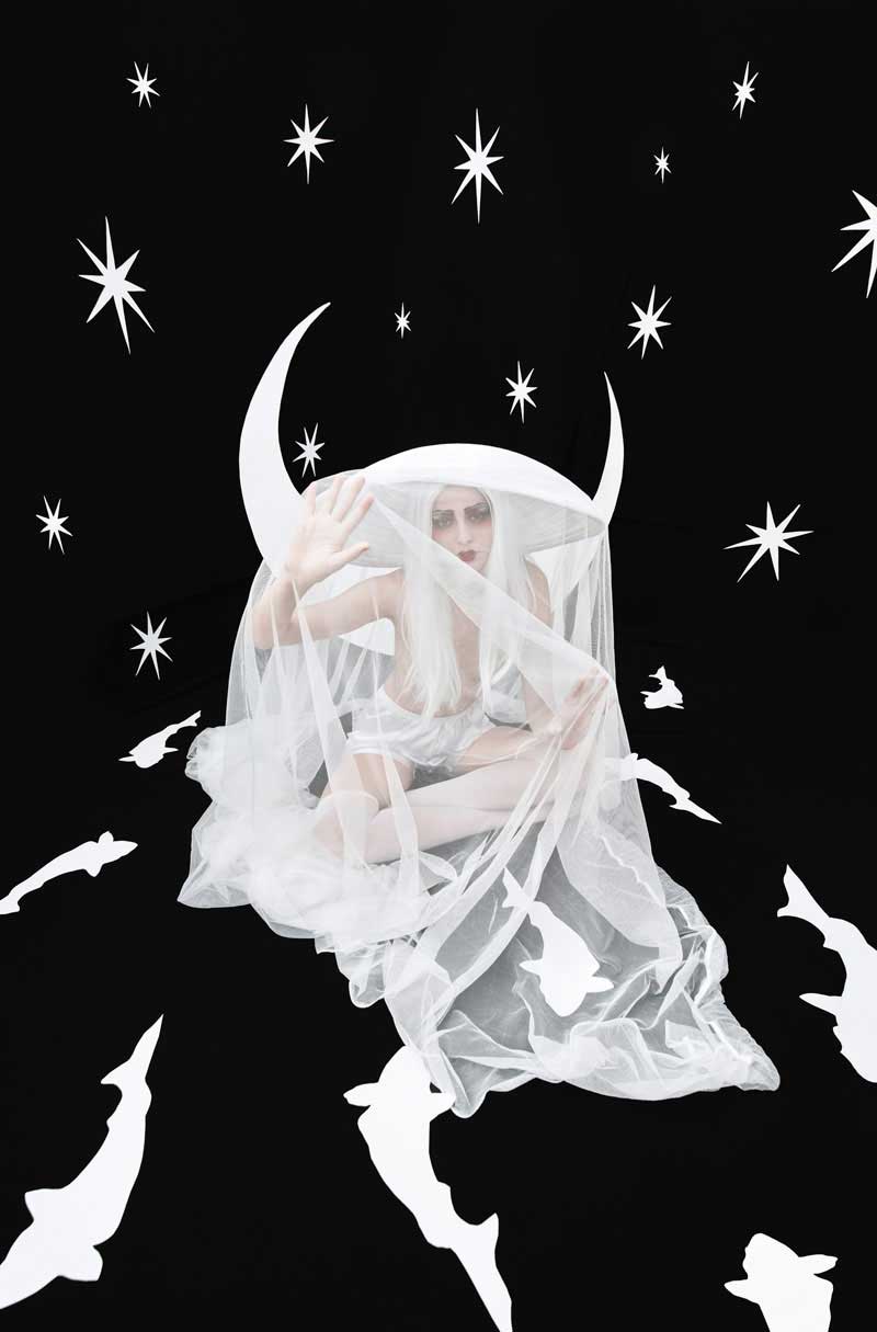 Cuál es el concepto de la historia que nos habéis enviado y cómo habéis resuelto su realización? “Las Dos caras de la luna” nos cuenta un cuento, todo parte de la Luna, Carlota quería crear una luna con sus manos y desarrollar todo el concepto a partir de ella, lo que nos hizo empezar a soñar un poco y querer jugar con los lados opuestos de la Luna, ¿Qué pasará al otro lado? Ahí empezamos a fomentar el proyecto y a idear ambos set. Sentimos que representamos a una generación a la cual se le ha vendido que sin dinero no se puede ser creativo, que necesitamos contactos, riqueza y todo estará solucionado. Se ha perdido el echarle valor a las cosas y trabajar duro en lo que apasiona, para nosotros la creatividad está en nuestro corazón y le damos forma como podemos La realización se ha resuelto con lo más básico, telas, cartulinas y pintura para ambos fondos (Todas las estrellas, peces, cuervos, lunas…están cortados con nuestras manos)En cuanto al estilismo contamos con la ayuda de dos personas muy creativas, nosotros les dimos las prendas y ellos crearon los looks sobre la marcha.