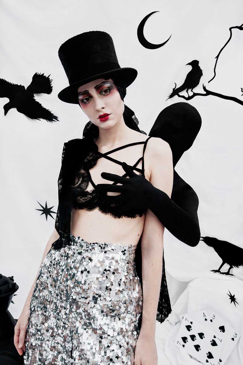 Foto superior: Lencería: Anne Summers / Pantalón: Attico / Chistera confeccionada a mano.