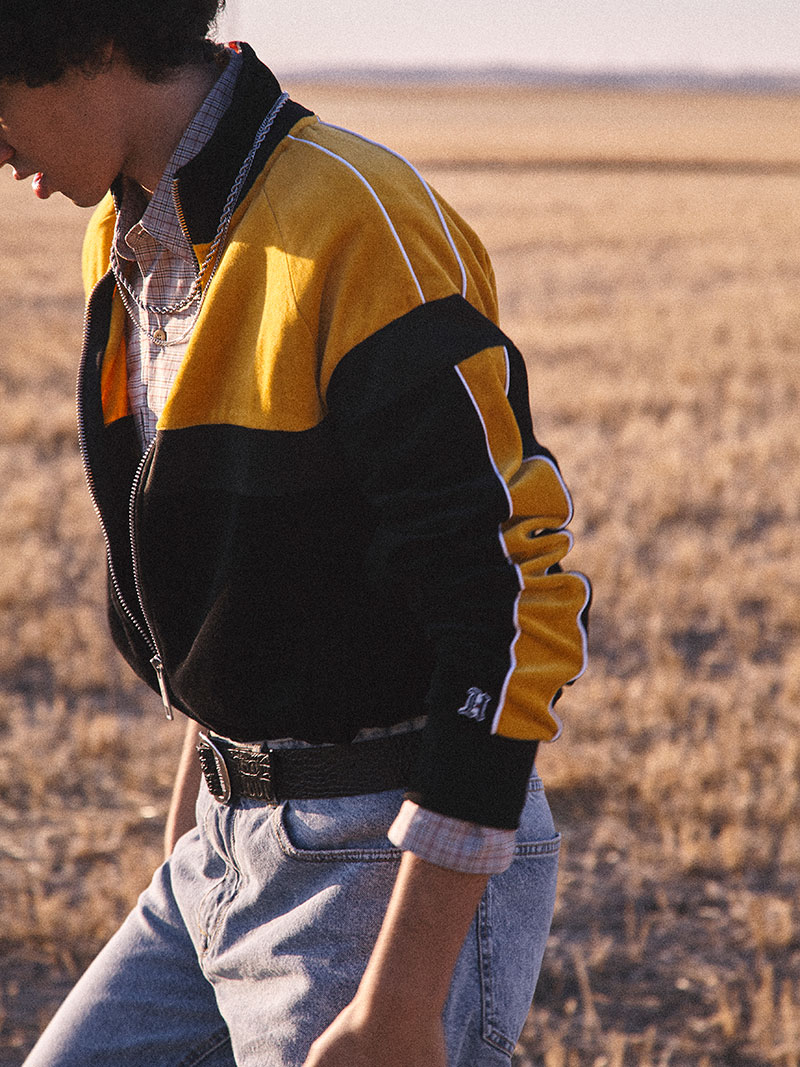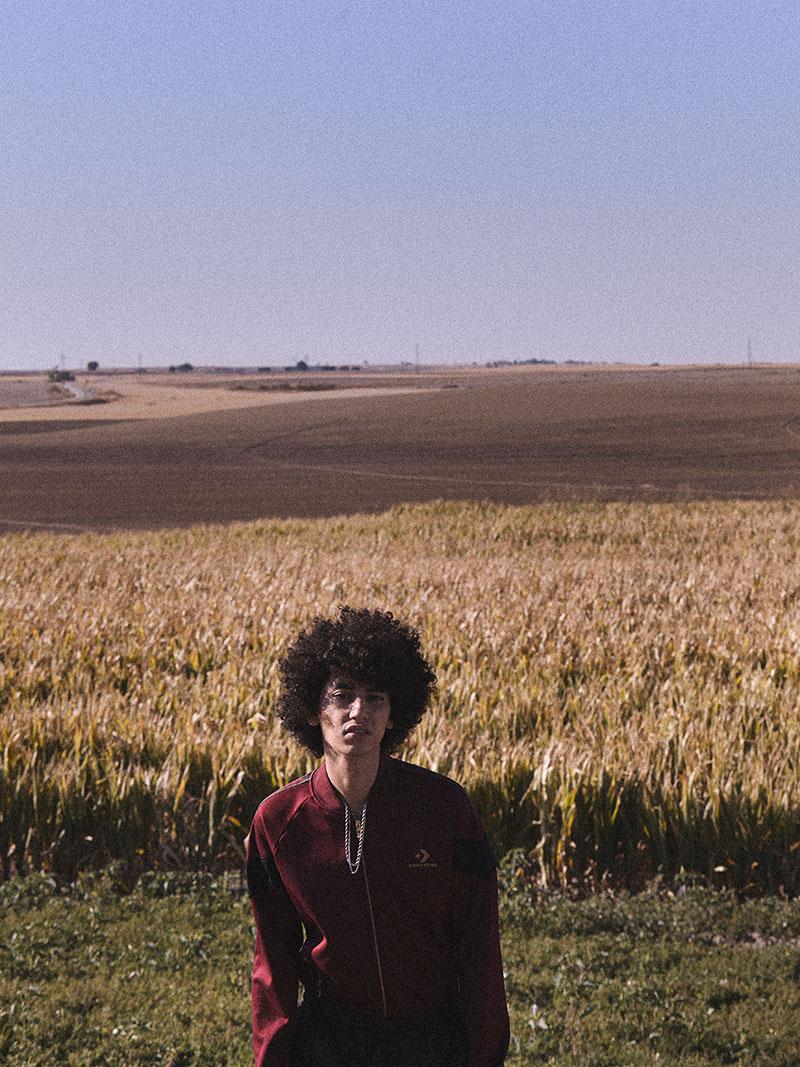 Sofian el Ben lleva chaqueta de Converse y collar del propio modelo