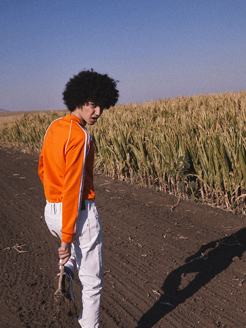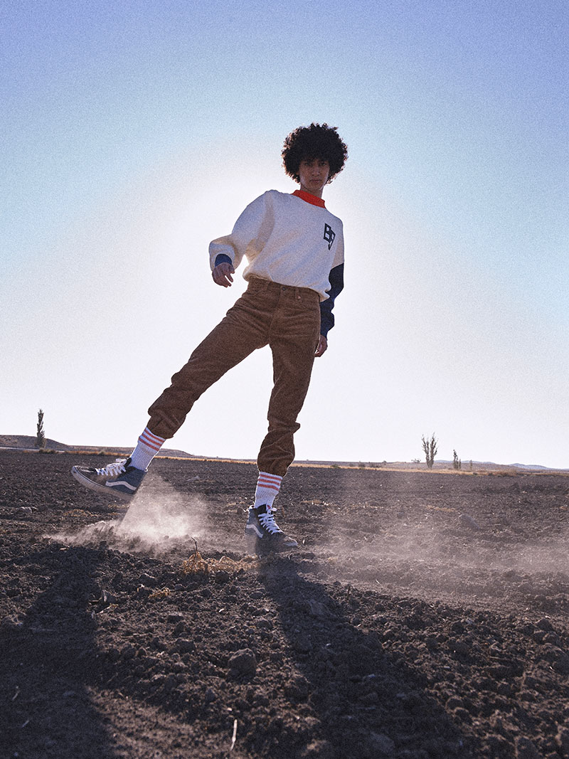 Sofian el Ben lleva suéter Puma x Ader Error, pantalón Levi’s Made and Crafted, calcetines adidas Originals y zapatillas Vans
