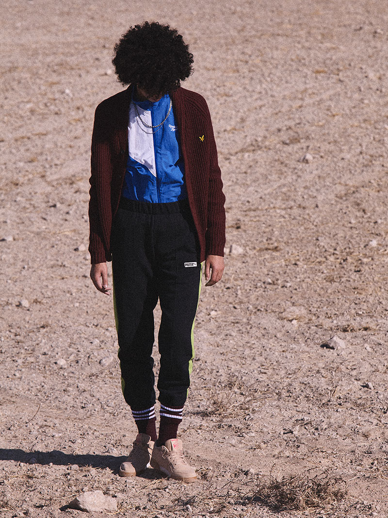 Sofian el Ben lleva chaqueta de punto Lyle and Scott, chaqueta de chándal de Reebok, pantalón de Puma, calcetines de adidas Originals, y zapatillas de Reebok