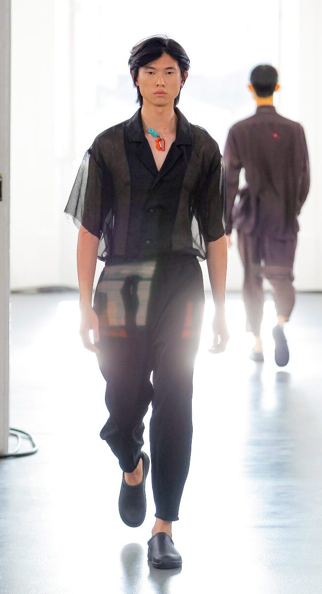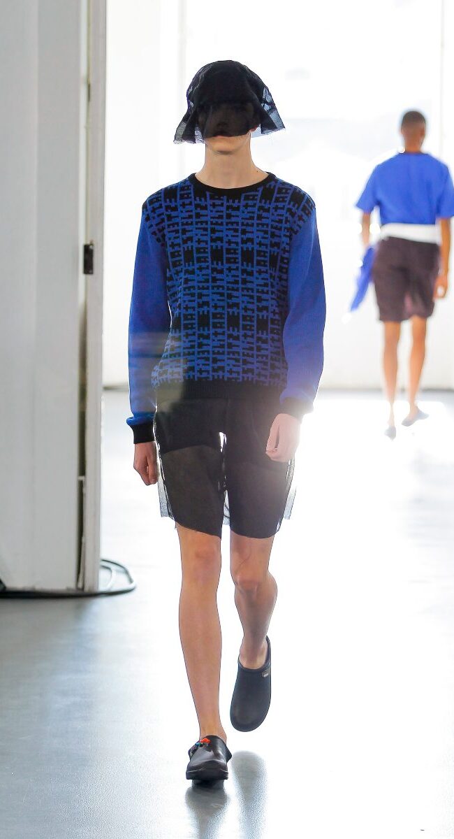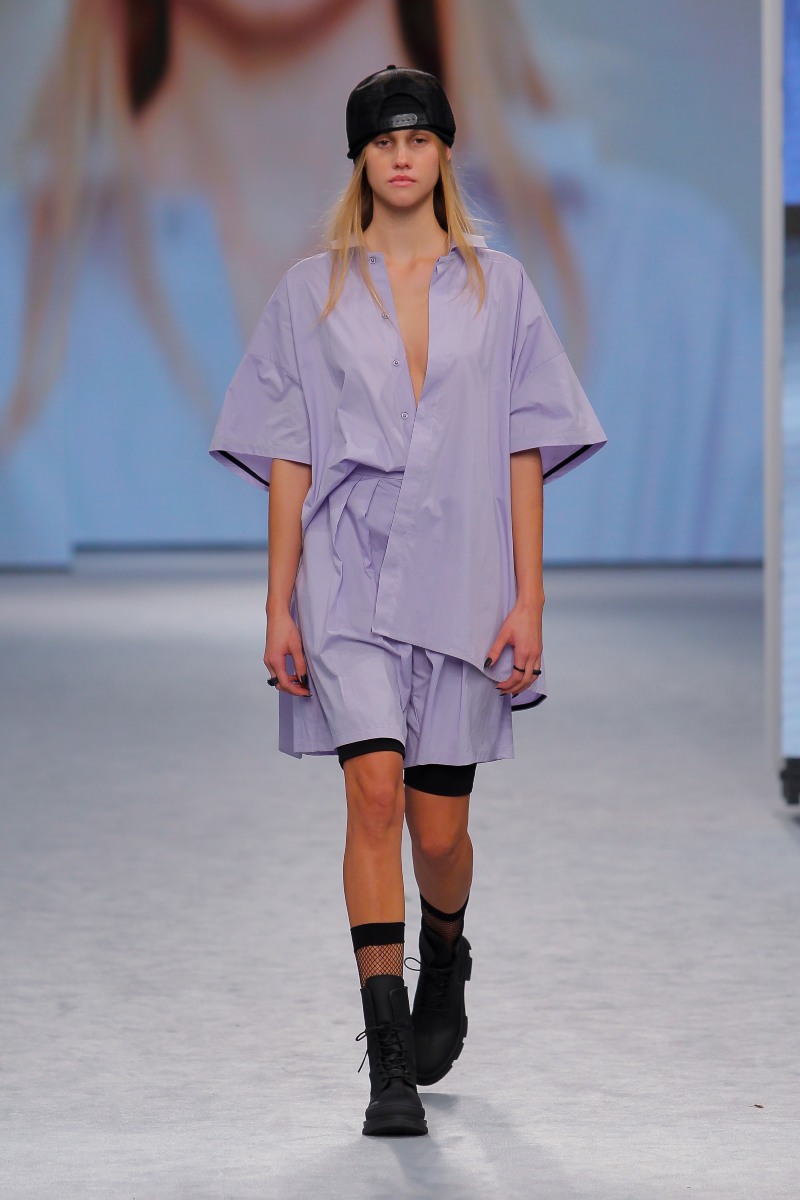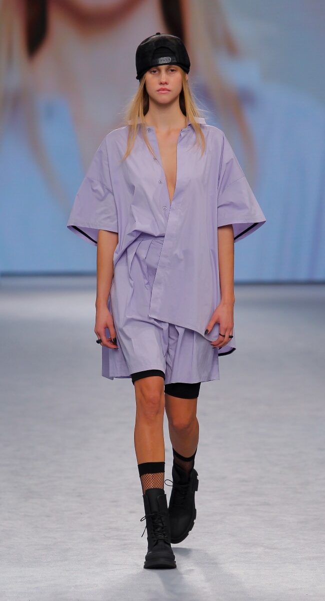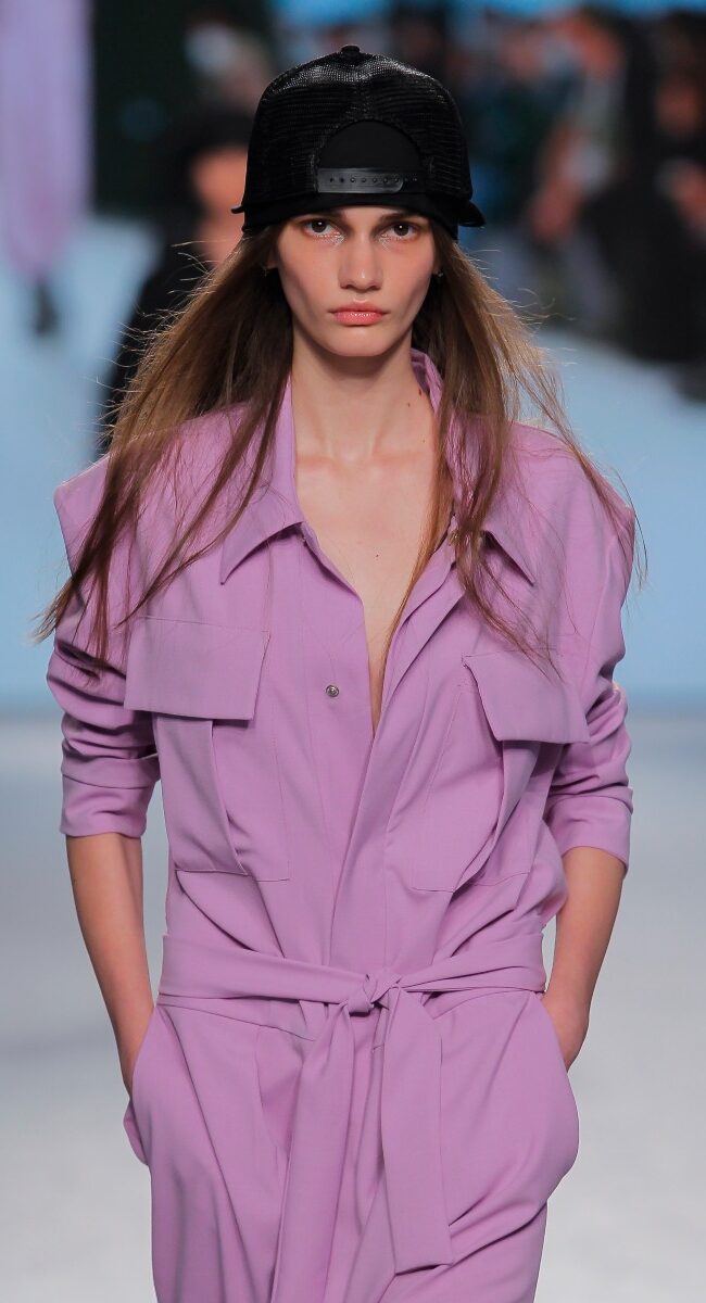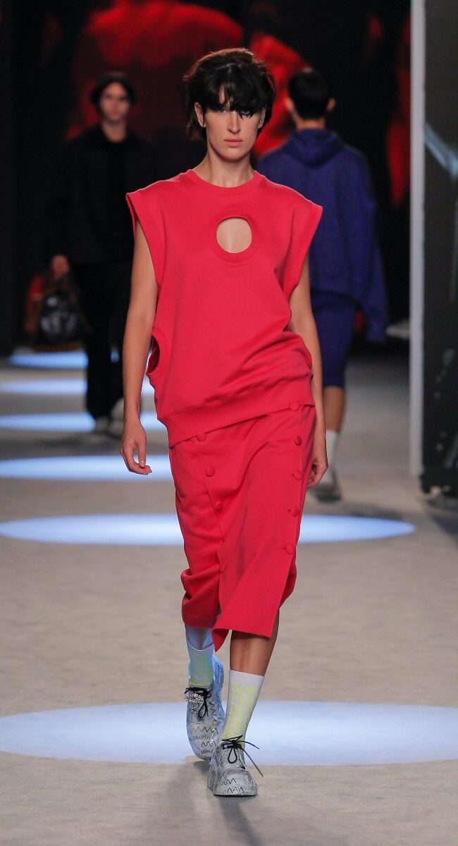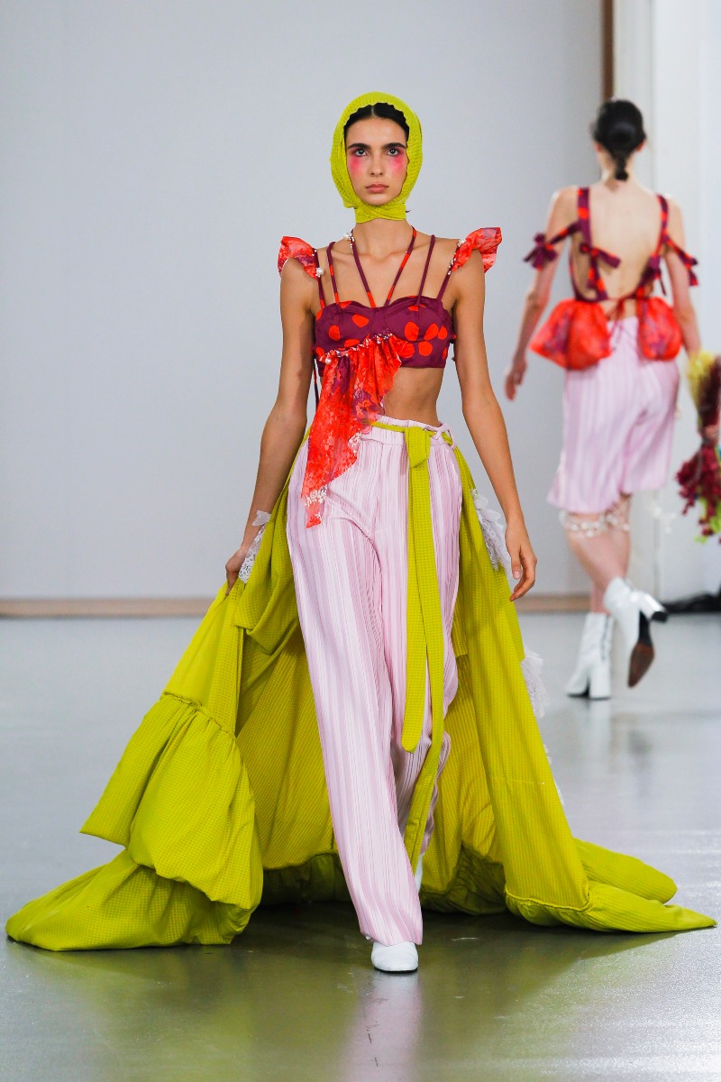 Todas las creaciones de Estelita Mendonça reflejaron una búsqueda de identidad normalizada. Entre los diseños presentados, la ropa de trabajo con un punto de reflexión y uniformidad, son las identidades más importantes de la firma y de su nueva propuesta para el SS22. Las siluetas estampadas añaden un toque único, donde se normalizan el gráfico y el tono neón.