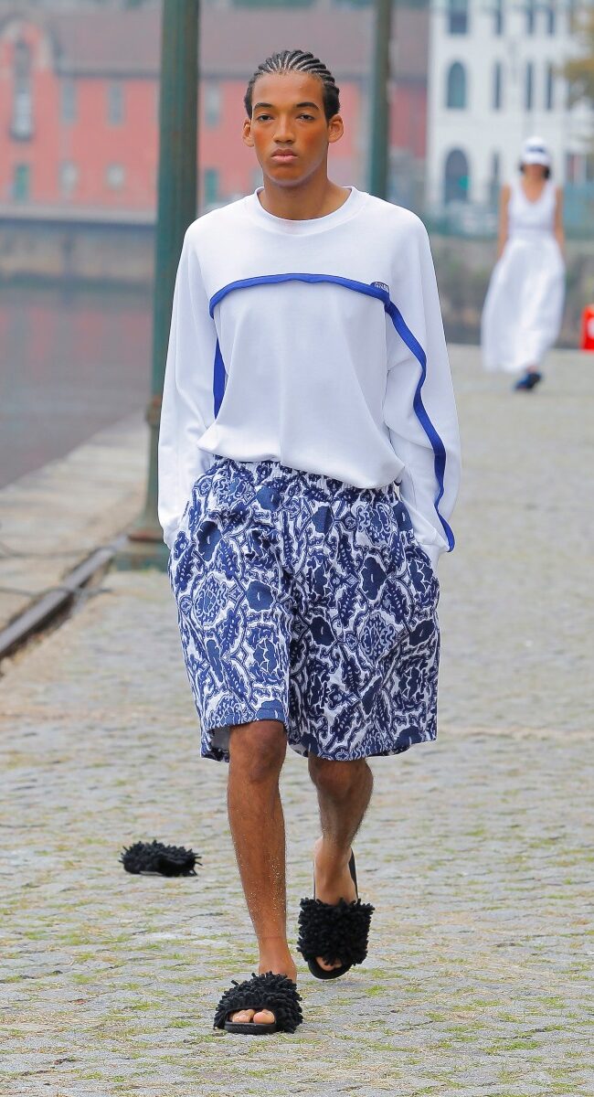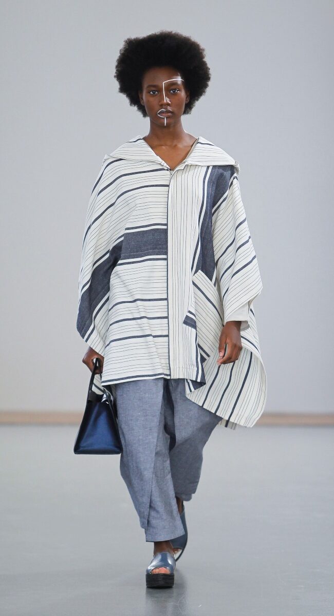 Furadouro SS22, así se llamó la línea presentada por Maria Gambina. La diseñadora reconocida en Portugal por su forma de entender el diseño, de nuevo no defraudó. Tanto por la fluidez de los vestidos, el estampado de rayas, el uso del blanco o la combinación de accesorios que recuerdan a la década de los noventa. No podemos dejar pasar, el estampado típico de la cerámica de Portugal en sudaderas o pantalones.