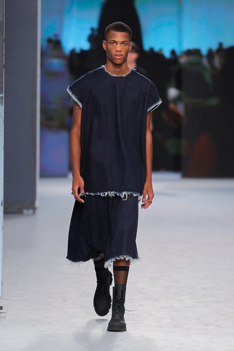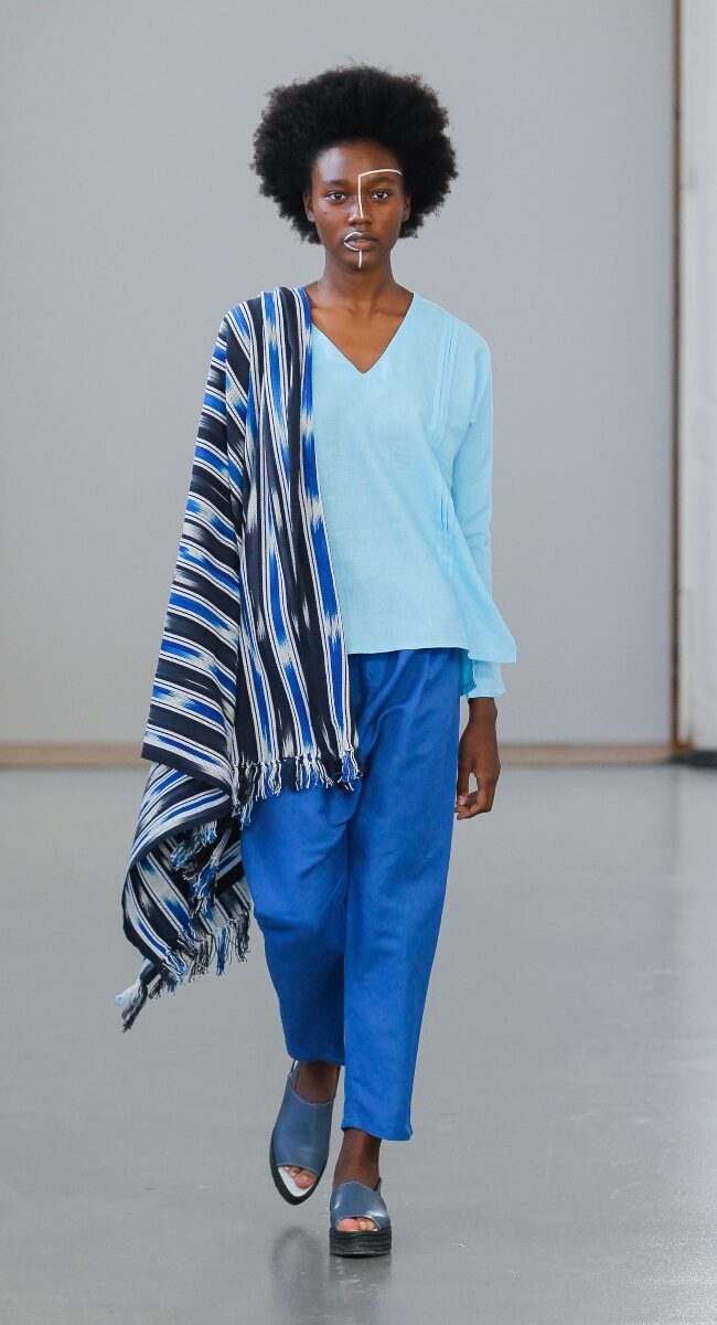 Una de las firmas invitada de moda africana fue ANISSA AIDA. Sus diseños son un viaje por países tan exóticos e inspiradores como Japón o Túnez. Un detalle que no pasó desapercibido fue el maquillaje. La diseñadora usó líneas de color azul o blanco, para mostrar la desigualdad y la equidad. Tanto para hombre como mujer, esta firma usó prendas holgadas con tejidos sostenibles. Todos los diseños enmarcan un viaje constante.