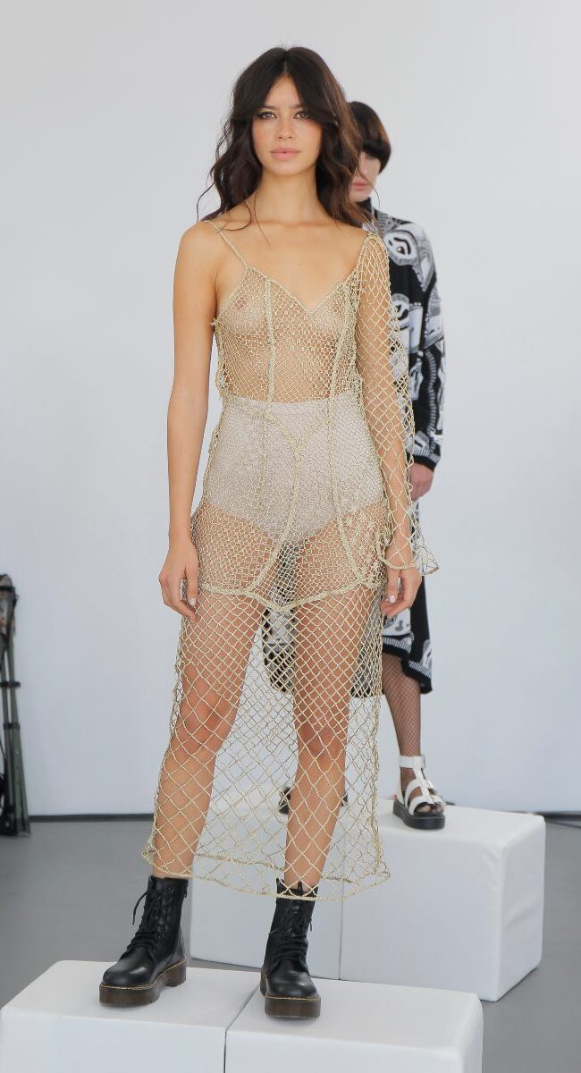 Lo artesanal llegó con Susana Bettencourt. Todo elaborado a mano, no puede faltar la difícil, pero impecable técnica del crochet. Tanto en tops, pantalones cortos, mangas abullonadas añadidas a camisas holgadas o vestidos mini, el crochet fue el actor principal. La diseñadora juega con el rojo, beige y estampado marinos, combinación muy complicada que en esta ocasión tiene un resultado de éxito.