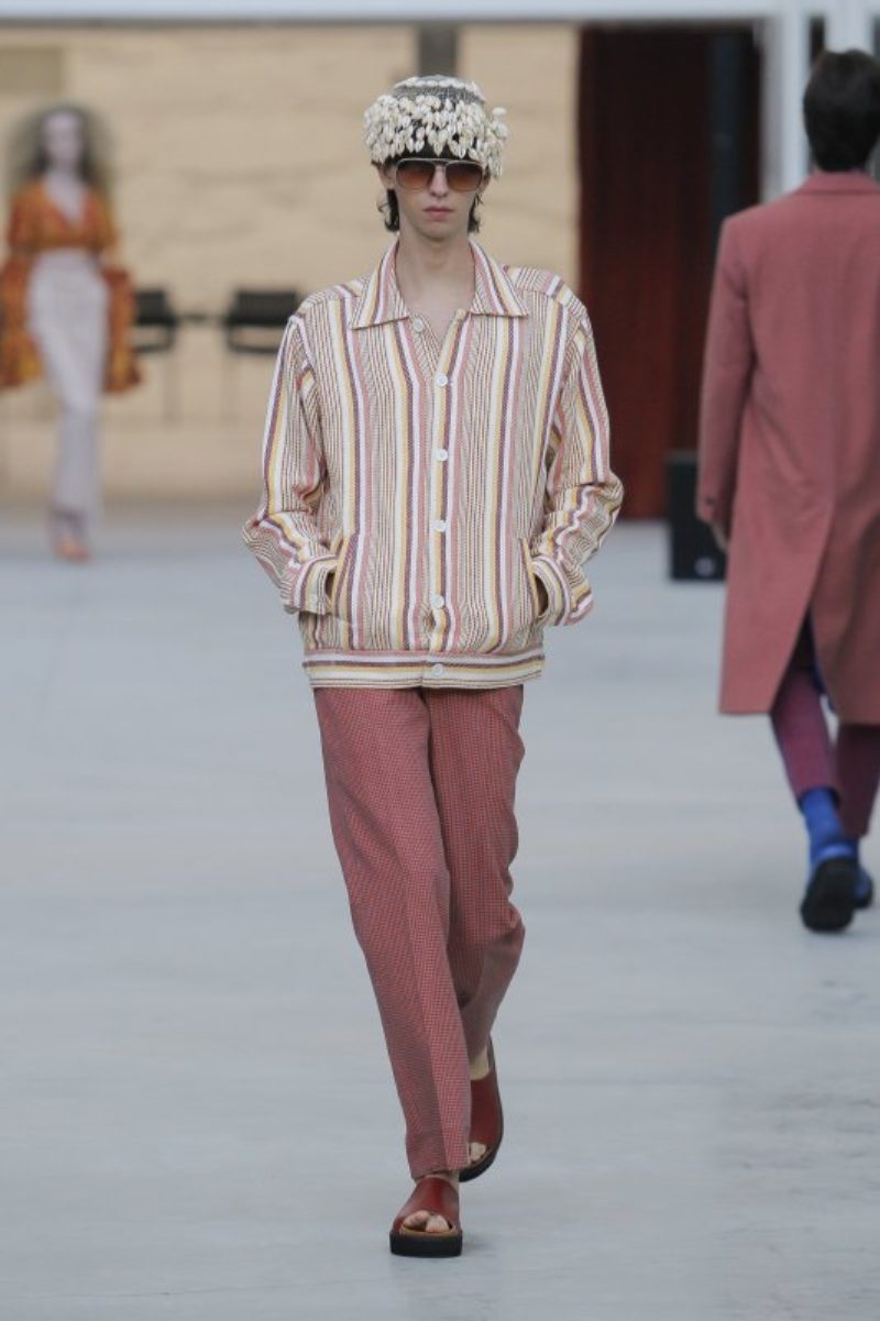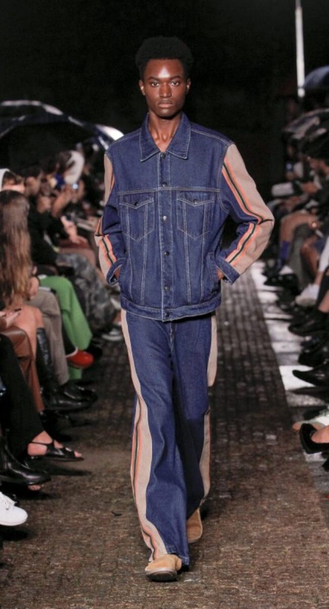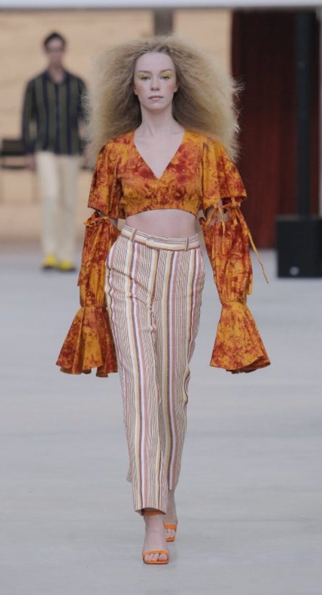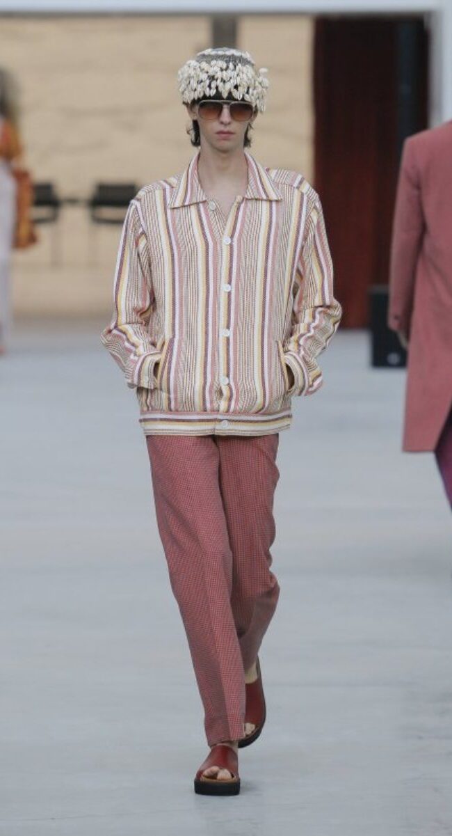 Si en Oporto hemos confirmado que la estética motera estará presente en 2023, la moda setentera, no se irá y además, estará con más fuerza que nunca. Kente Gentlemen se imagina la próxima temporada con colores cálidos, pantalones de acabado acampanado y estampado de rayas. Sin ninguna duda, el diseñador quiso trasladar al público a una continua libertad de expresión y noches de fiesta sin mirar el reloj.