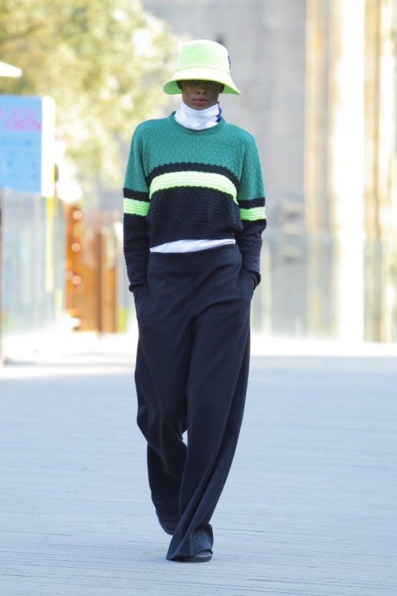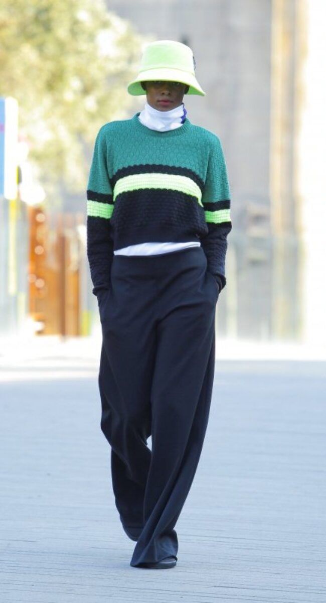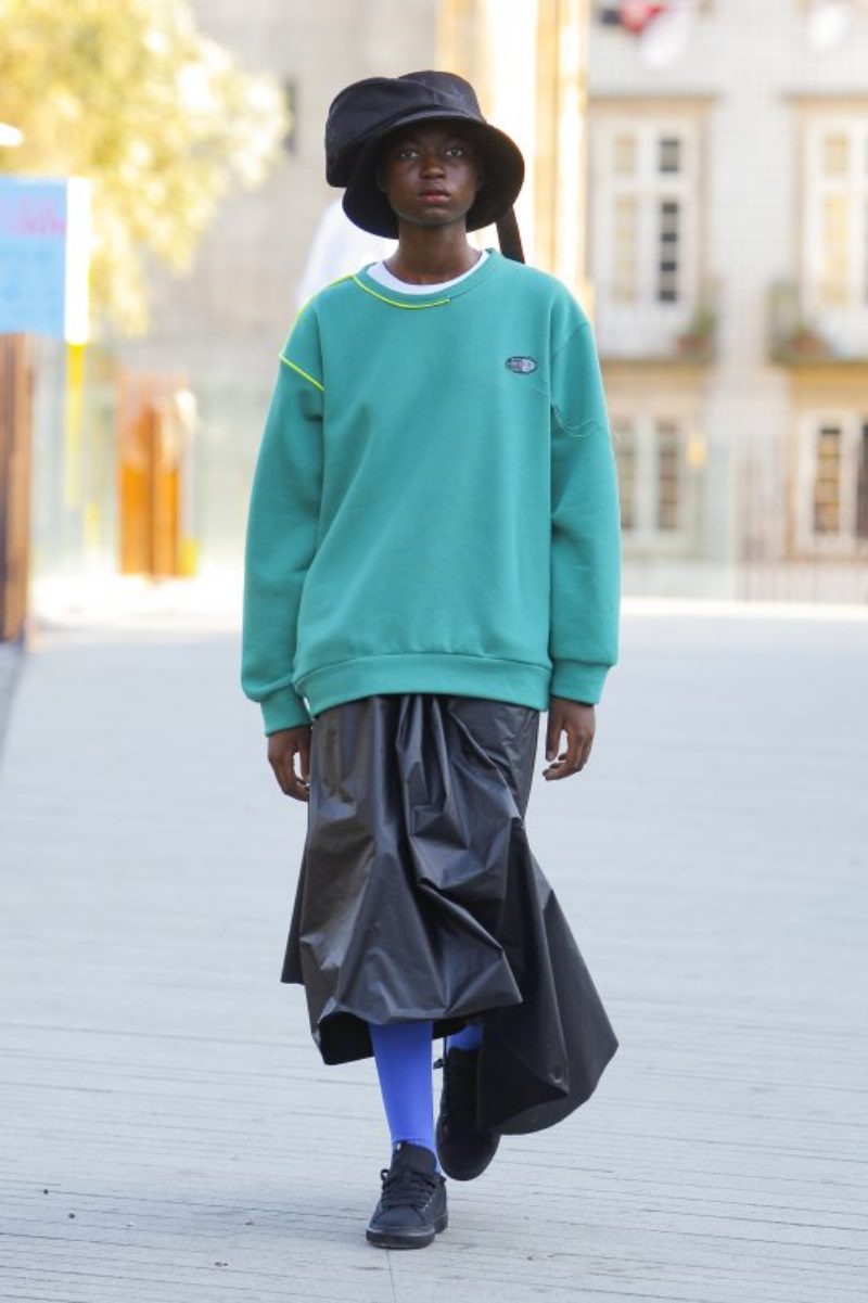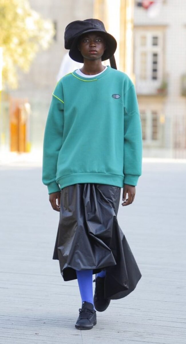 Se puede decir que Maria Gambina fue la contradicción a todo lo que se pudo ver en Oporto. Jersey de cuello redondo, gorros pescadores en amarillo neón, faldas largas asimétricas o pantalones cargo con múltiples bolsillos. La diseñadora se movió por la facilidad que tienen para combinar diseños estáticos, como es un abrigo largo, con colores neón que fueron muy protagonistas en las prendas.