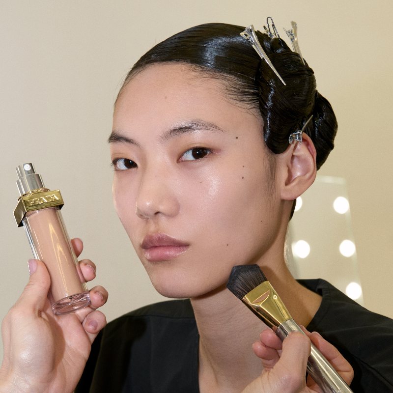 Para que el maquillaje estuviera perfecto, primero hay que preparar la piel. Lynsey Alexander la preparó con el cosmético Prada Augmented Skin The Essence, de la gama Skincare. Este tónico es crucial para transformar la piel al momento. Con muy poco producto, renueva la textura y a la vez la exfolia y la prepara para los siguientes pasos en el maquillaje. Posteriormente, la profesional aplicó Prada Augmented Skin The Serum. Este sérum será tu favorito desde hoy, porque vas a descubrir que su crema se transforma en agua y logra refinar el tono de la dermis. Por cierto, asegúrate que el producto está completamente absorbido antes de la aplicación de la base de maquillaje.
