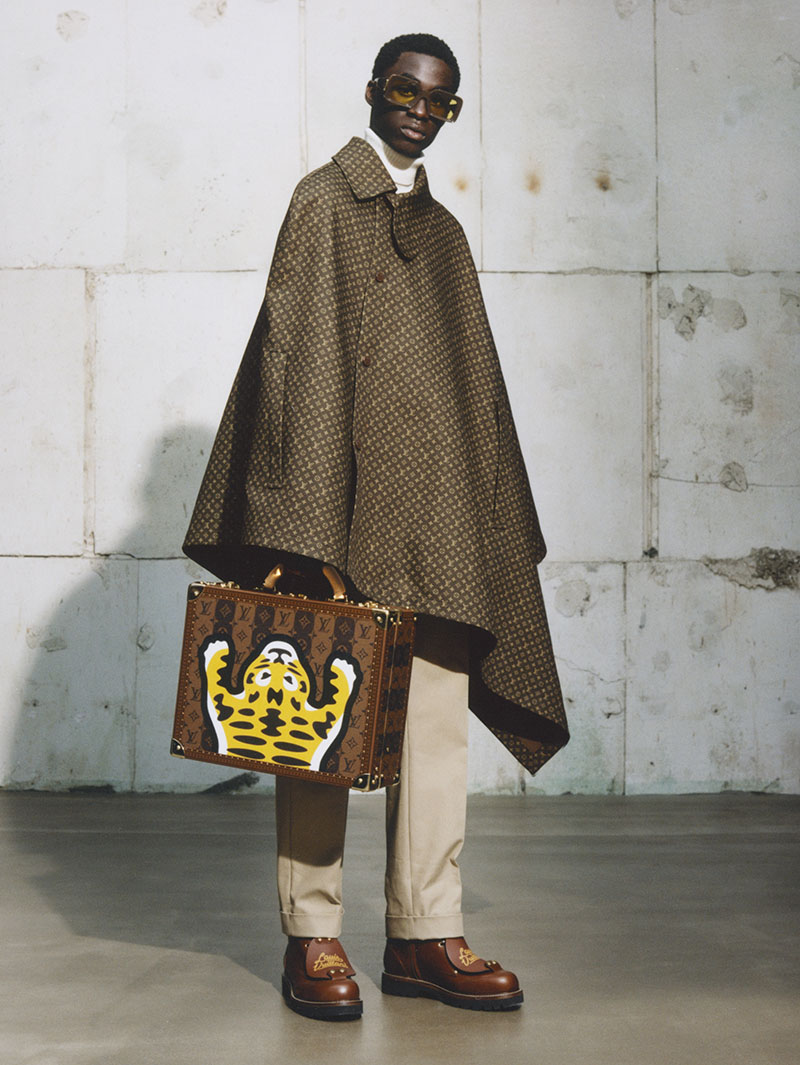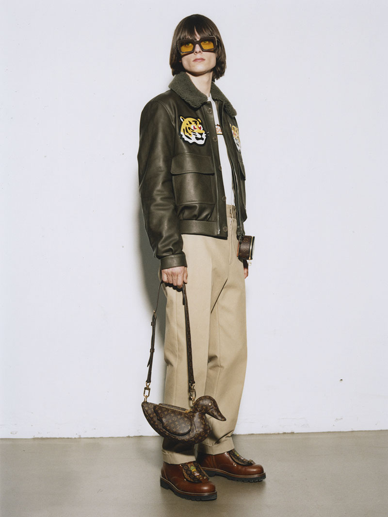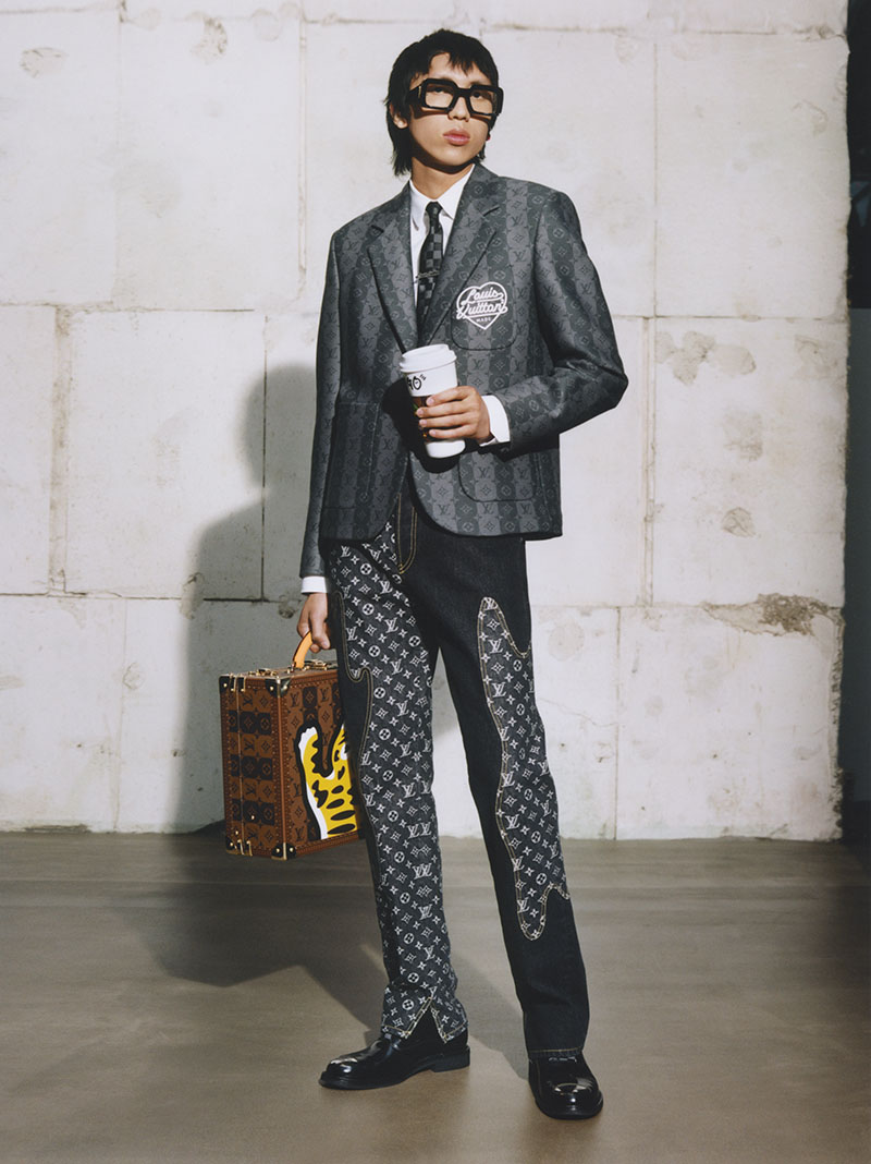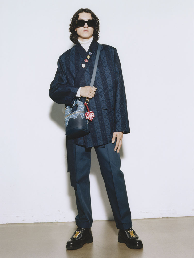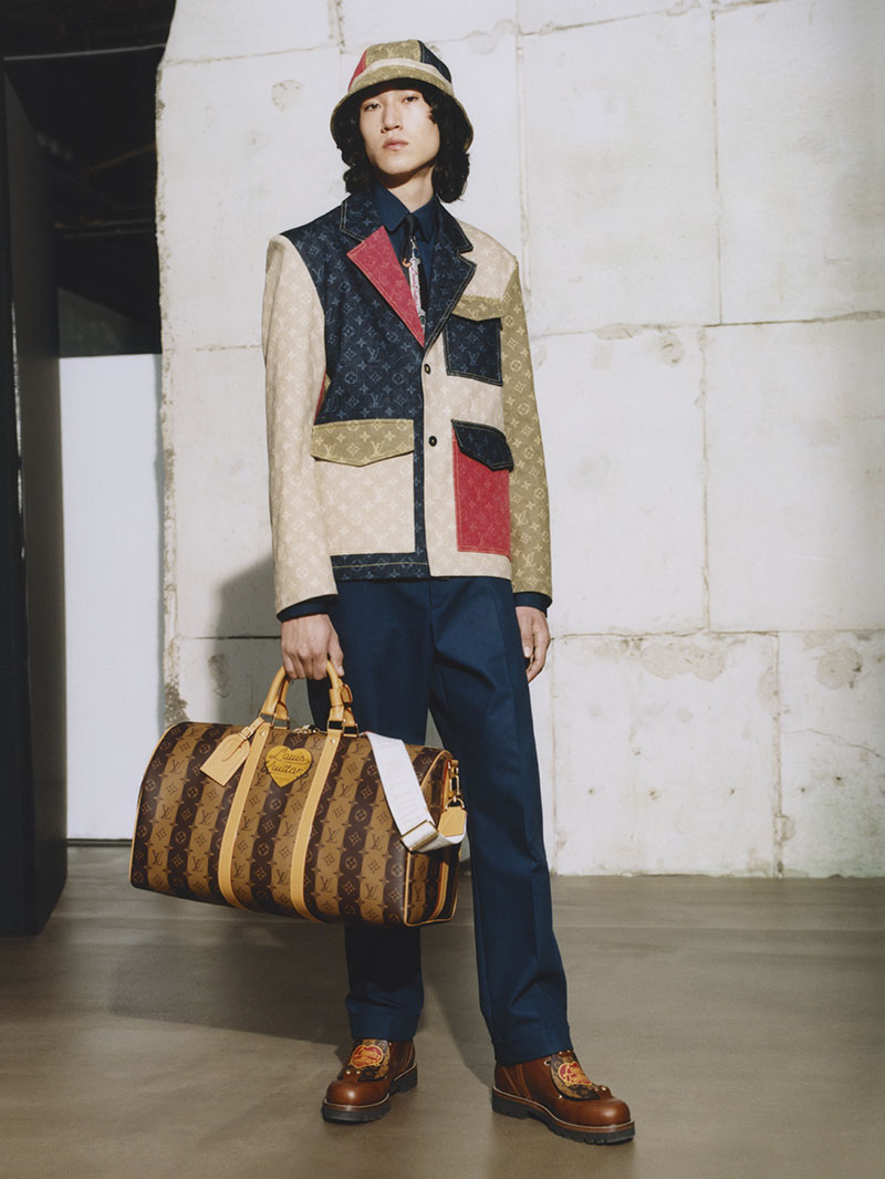 Los adornos y accesorios originarios del simbolismo sartorial, los iconos militares y los trajes tradicionales se observan a través de una sensibilidad especial llena de toques de la cultura japonesa. Esto se materializa en la colección de LV² Primavera 2022 a través de prendas como las blazers estilo años 50 en color-block, trajes vaqueros generacionales en camuflaje Monogram, una blazer de remo corta blasonada con rayas Monogram o los pantalones chinos que recuerdan a los uniformes escolares.